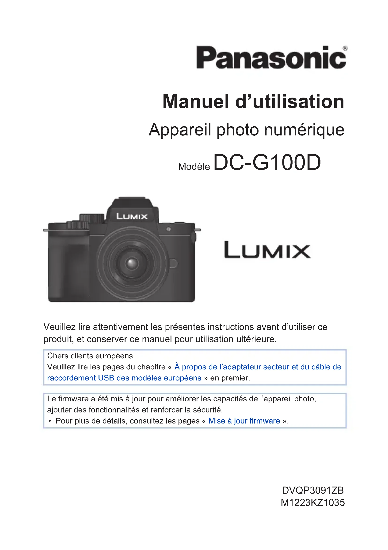 Manuel d’utilisation Appareil photo numérique Modèle DC-G100D Veuillez lire attentivement les présentes instructions avant d’utiliser ce produit, et conserver ce manuel pour utilisation ultérieure. Chers clients européensVeuillez lire les pages du chapitre « À propos de l’adaptateur secteur et du câble de raccordement USB des modèles européens » en premier.Le firmware a été mis à jour pour améliorer les capacités de l’appareil photo, ajouter des fonctionnalités et renforcer la sécurité.• Pour plus de détails, consultez les pages « Mise à jour firmware ». DVQP3091ZB M1223KZ10352 À notre clientèle, Nous vous remercions d’avoir fait l’acquisition de cet appareil photo numérique Panasonic. Veuillez lire attentivement ce document et conservez-le à portée de main pour vous y référer ultérieurement. Veuillez noter que les commandes et les composants, les éléments de menu, etc. réels de votre appareil photo numérique peuvent sembler quelque peu différents de ceux montrés dans les illustrations contenues dans ce document. Il importe de respecter les droits d’auteur. L’enregistrement de bandes ou de disques préenregistrés ou de tout matériel publié ou diffusé pour un usage autre que strictement personnel peut enfreindre les lois sur les droits d’auteur. L’enregistrement de certain matériel, même à des fins personnelles, peut aussi être interdit.
