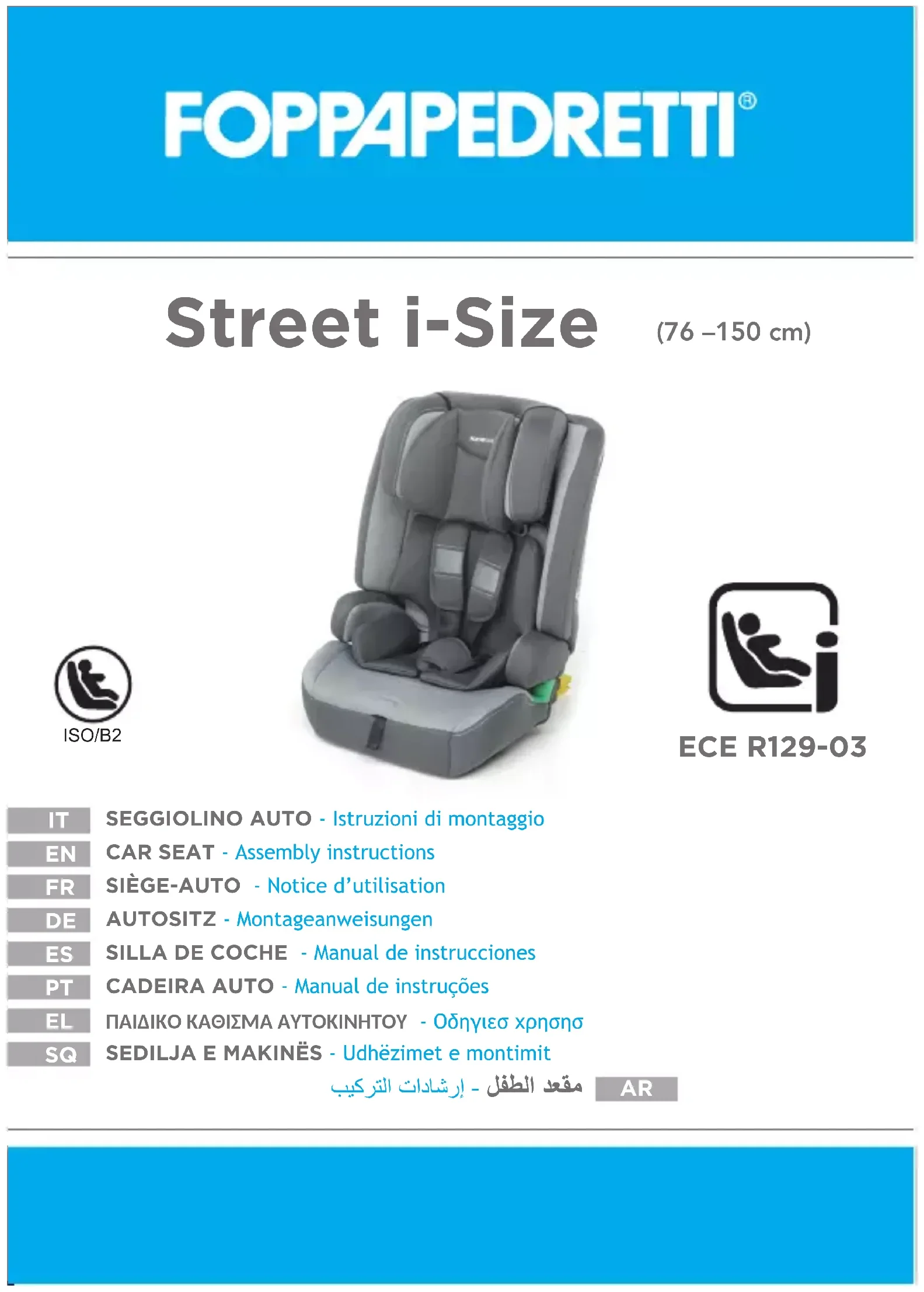 - Ceci est un systeme de retenue avance “ i-Size” pour enfants. Homologue conformement au reglement n° 129/03, il est destine a etre utilise dans des vehicules sur des sieges “compatibles avec les systemes de retenue i-Size”, comme indique par le constructeur dans le manuel d’utilisation du vehicule. “Street i-Size” peut etre installe sur tous les sieges-auto homologues i-Size et sur tous les sieges-auto homologues ISOFIX. En cas de doute, consulter le fabricant ou le revendeur du systeme de retenue pour enfants.