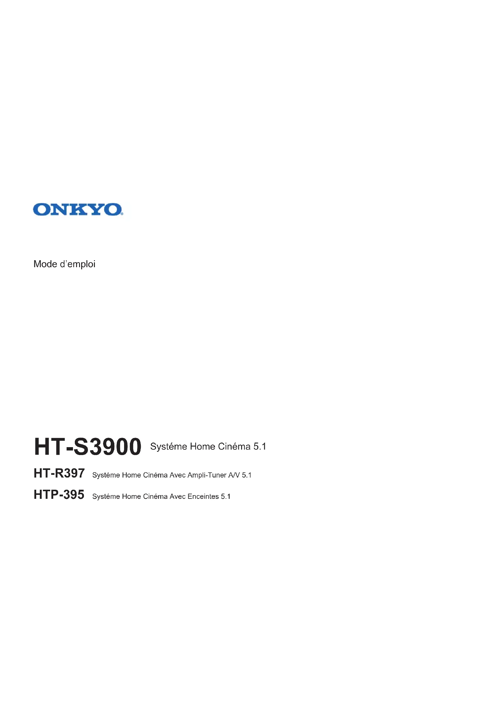 Mode d’emploi HTP-395 Systéme Home Cinéma 5.1 HT-S3900 Systéme Home Cinéma Avec Ampli-Tuner A/V 5.1 HT-R397 Systéme Home Cinéma Avec Enceintes 5.12 Nous vous remercions pour cet achat d’un produit Onkyo. Nous vous demandons de lire soigneusement ce mode d’emploi ; vous serez ainsi à même de faire fonctionner l’appareil correctement. Préparatifs