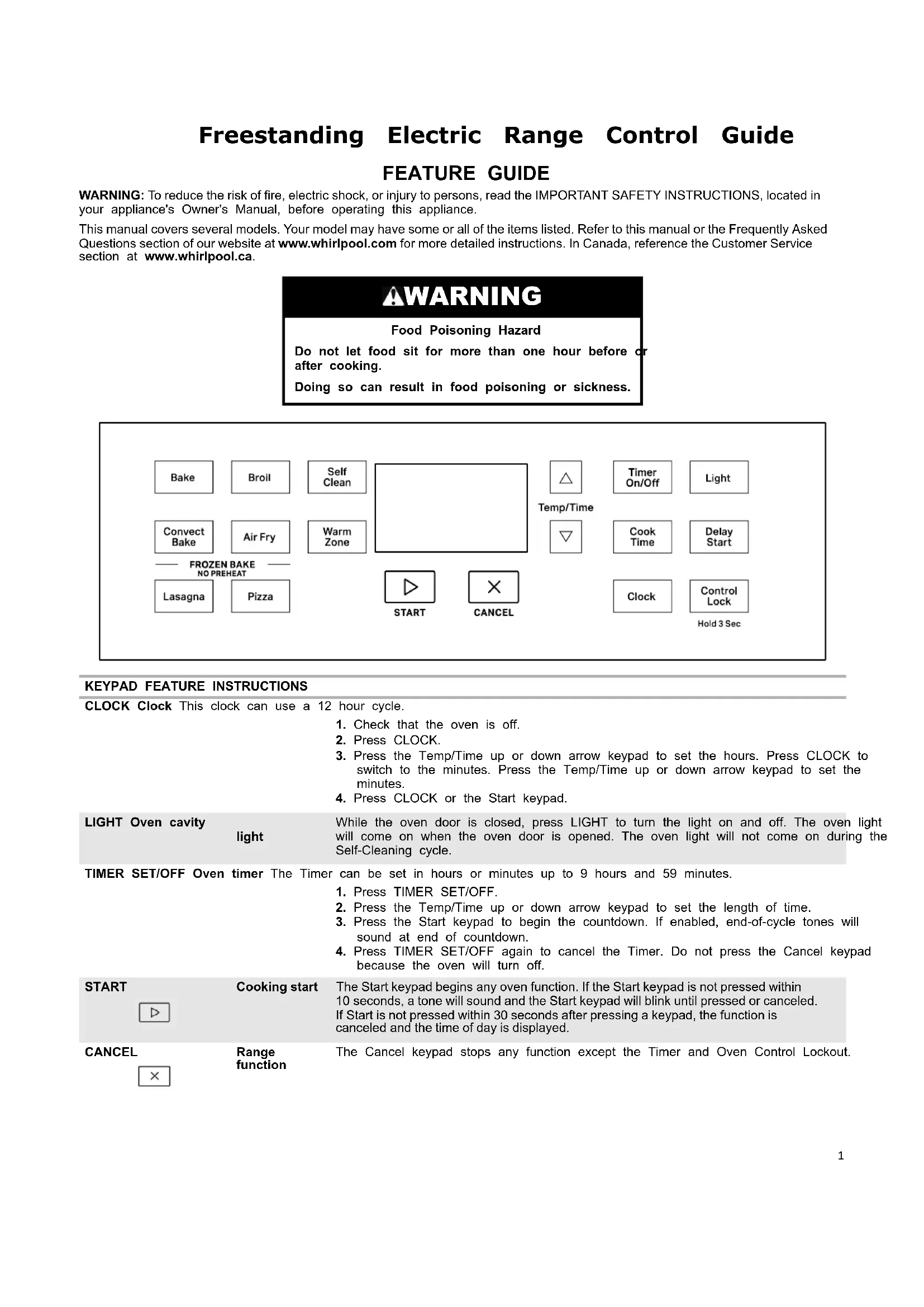 AVERTISSEMENT : Pour réduire le risque d’incendie, de décharge électrique ou de blessures, lire les INSTRUCTIONS IMPORTANTES DE SÉCURITÉ du guide d’utilisation de votre appareil avant de faire fonctionner cet appareil. Ce manuel concerne plusieurs modèles. Le modèle que vous avez peut comporter toutes les caractéristiques énumérées ou seulement certaines d’entre elles. Reportez-vous à ce manuel ou à la section Foire Aux Questions de notre site Web sur www.whirlpool.com pour des instructions plus détaillées. Au Canada, consulter la section service à la clientèle à www.whirlpool.ca. AVERTISSEMENT Risque d'empoisonnement alimentaire Ne pas laisser des aliments dans un four plus d'une heure avant ou après la cuisson. Le non-respect de cette instruction peut causer un empoisonnement alimentaire ou une maladie.