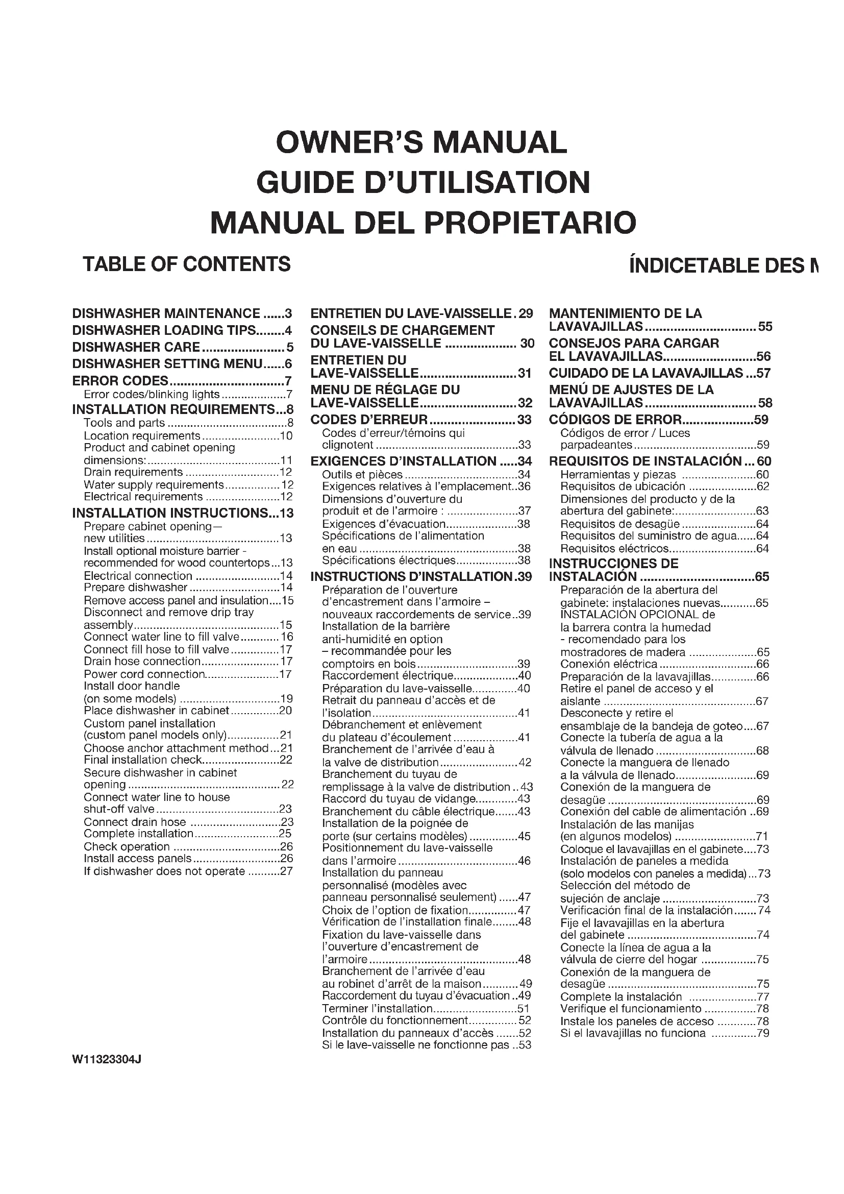 po à 2po (38mm à 50mm) (3maximum) Plus long tuyau de vidange optionnel d’une longueur maximale de 12pi (3,7m) REMARQUE: Doit être conforme à toutes les normes de test AHAM/IAPMO, convenir à des raccordements de vidange de 1po (25mm) et être résistant à la chaleur et aux détergents. No de pièce: W11381654 REMARQUE: Si l’on utilise un tuyau exible tressé, remplacer le tuyau d’alimentation après 5ans d’utilisation pour réduire le risque de défaillance du tuyau. Inscrire la date d’installation ou de remplacement du tuyau sur celui-ci, pour référence ultérieure. REMARQUE: S’assurer d’acheter uniquement des pièces et des accessoires Whirlpool certiés par le fabricant de l’appareil. Il se peut que l’installation nécessite des pièces supplémentaires. Pour commander, consulter les coordonnées indiquées dans le Guide de démarrage rapide. Installation de type B (lave-vaisselle installé loin d’une source d’eau/d’évacuation): La conduite d’alimentation en eau et le tuyau de vidange applicables seront fournis par l’installateur.36 Pour les installations à raccordement direct Pour cordon d’alimentation Passe-câble d’ armoire Pour un trou de 1