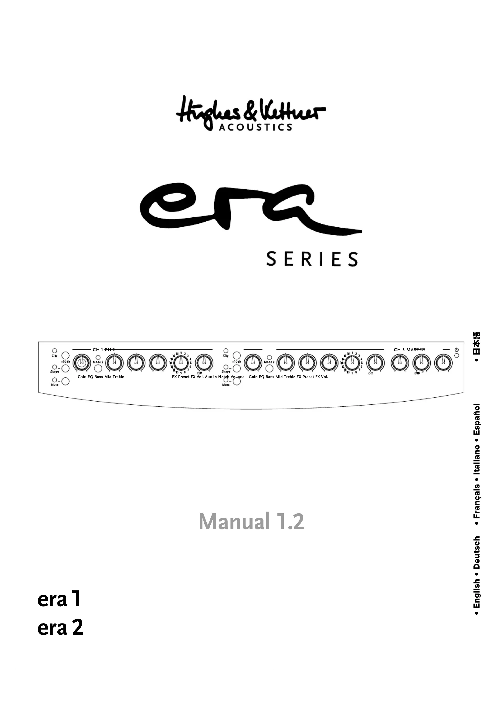era 1 era 1 / era 2 era 2 avant de brancher l'ampli ! Version 2.5 10/201719 era 1 / era 2 – Manual 1.2 1 Raccords et commandes L’ampli era 1 era 1 / era 2 era 2 possède deux canaux indépendants identiques (CH 1 et CH 2) destinés aux instruments et à la voix, une troisième entrée (CH 3) destinée à des lecteurs externes comme un lecteur MP3, ainsi qu’une qua-trième entrée (CH 4) pour les unités d’effets externes, une table de mixage ou des instruments préamplifiés.Parallèlement, l’appareil propose, grâce à une « DI Out » flexible, une sor-tie « Line Out » réglable, une sortie « Channel Out » (via FX Send), une prise casque (Phones) et une « Optical Out », un large éventail de sorties variées et orientées pratique pour des applications professionnelles, telles des concerts ou des sessions d’enregistrement.Attention : af in d’éviter les surprises trop sonores, penser à couper le volume de la section Master (ramener le potentiomètre en butée de gauche) avant la mise sous tension.