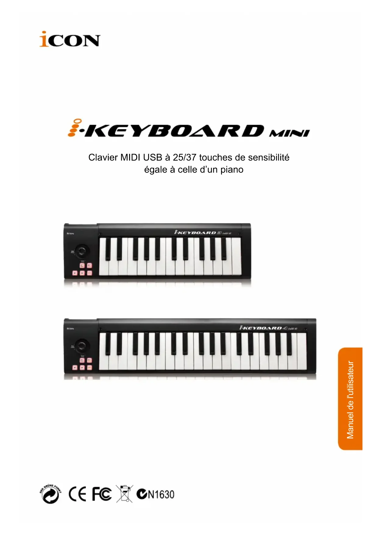 1 x câble USB 2.0 Nous vous remercions pour l’achat du contrôleur par connexion USB MIDI, iKeyboard 3 mini/iKeyboard 4 mini, d’ICON Nous pensons sincèrement que ce produit vous comblera pendant des années mais, si quelque chose ne vous convient pas, nous y nous efforcerons d’y remédier. Au l de ces pages vous découvrirez une description détaillée des caractéristiques du iKeyboard 3 mini/iKeyboard 4 mini mais aussi une visite guidée de ses panneaux avant et arrière, des instructions de conguration et d’utilisation étape par étape ainsi que toutes les spécications. Veuillez enregistrer le produit sur notre site Web à l'aide du lien www.iconproaudio. com/registration : Veuillez suivre la procédure étape par étape. Commencez par saisir le numéro de série de l'appareil ainsi que vos informations personnelles, etc. En enregistrant votre produit en ligne, vous aurez droitauserviceetau soutienaprès- ventedenotrecentred'aide en visitant notre site Web à l'adresse www.iconproaudio. com. En outre, tous les produits enregistrés sous votre compte seront répertoriés sur votre page personnelle de produit où vous trouverez des informations mises à jour telles que les mises à niveau de micrologiciels/pilotes, les progiciels, les téléchargements de modes d'emploi, etc. pour votreappareil. Comme avec la plupart des appareils électroniques, nous vous recommandons vivement de conserver l'emballage d'origine. Dans le cas peu probable où le produit doit être retourné pour réparation, l'emballage d'origine (ou son équivalent raisonnable) est exigé. Grâce à des soins appropriés et à une circulation d’air correcte, votre iKeyboard 3 mini/iKeyboard 4 mini fonctionnera sans problème pendant des années. Nous vous conseillons d’enregistrer votre numéro de série dans l’espace ci-dessous à titre de référence future.5 Enregistrement de votre produit ICON Pro Audio sur votre compte personnel