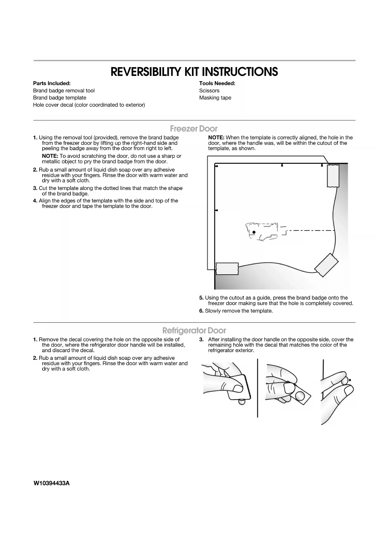 remaining hole with the decal that matches the color of the refrigerator exterior. W10394433AINSTRUCTIONS DE LA TROUSSE DE RÉVERSIBILITÉ Pièces fournies : Outil de retrait de l'insigne de la marque Gabarit de l'insigne de la marque Transfert de cache pour les trous (couleur assortie à l'extérieur) Outillage nécessaire : Ciseaux Ruban adhésif de masquage Porte du congélateur