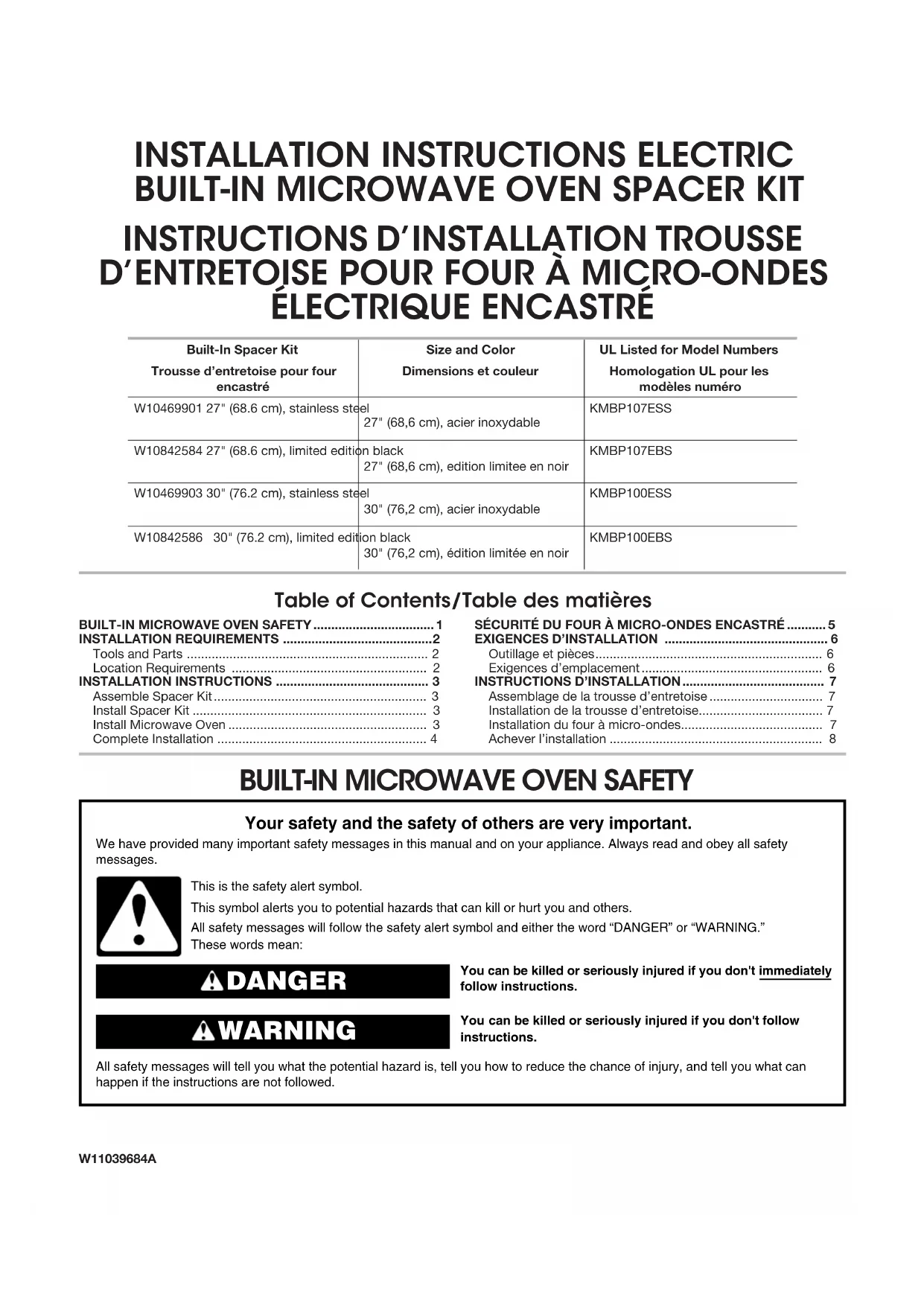 Si vous avez besoin d’assistance ou de service : Consulter la section “Assistance ou service” du guide d’utilisation et d’entretien ou contacter le concessionnaire auprès duquel la trousse d’entretoise pour four à micro-ondes encastré a été achetée. W11039684A 11/16