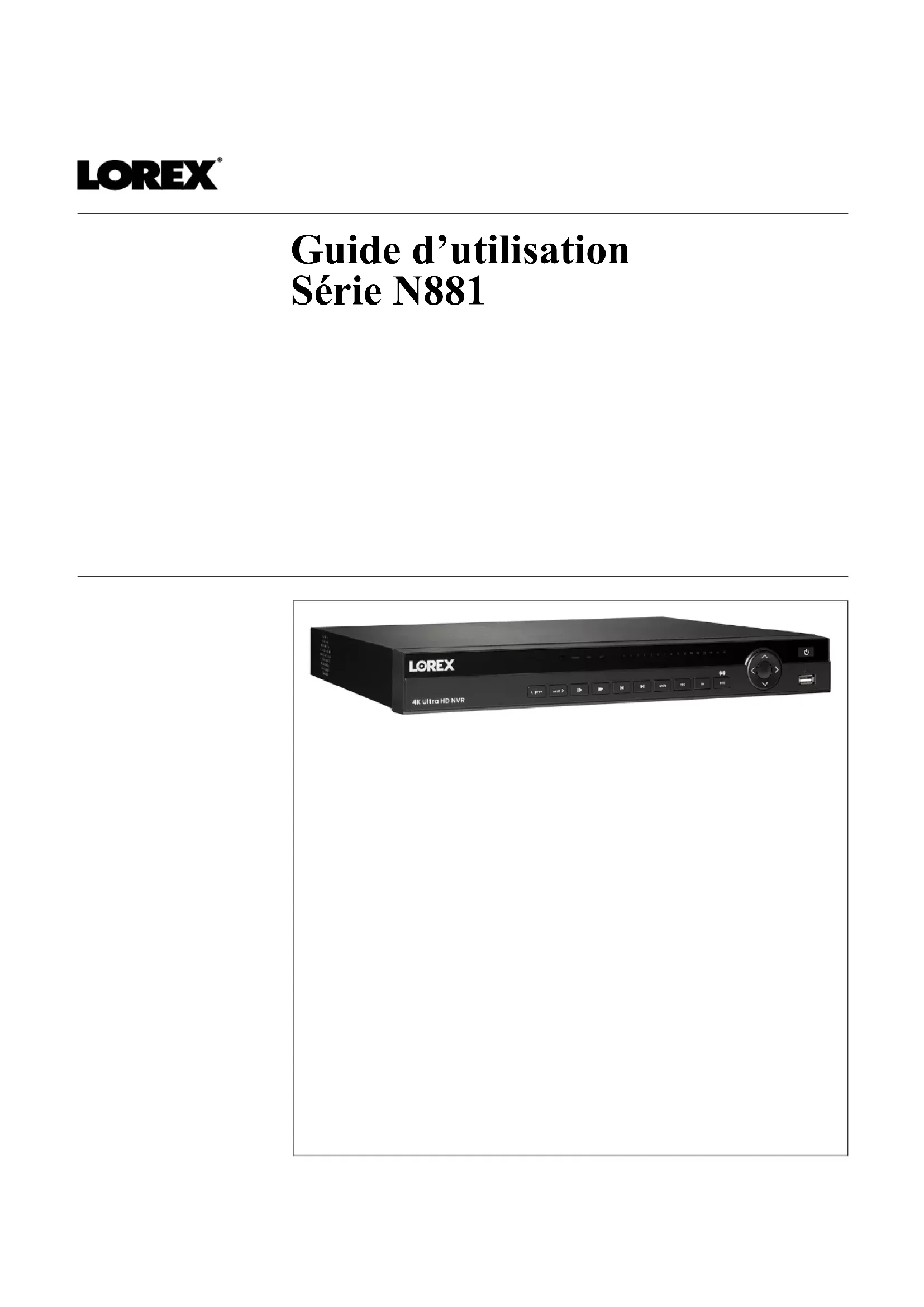 Guide d’utilisation Série N881Guide d’utilisation Série N881 #LX400113; r. 3.0/56331/56332; fr-CA iiiMerci d’avoir acheté ce produit. Corporation Lorex s’engage à fournir à nos clients une solution de sécurité fiable et de haute qualité. Ce manuel fait référence aux modèles suivants : N881A63B N881A38B Pour consulter en ligne le manuel, les téléchargements et les mises à jour de produits les plus récents, et pour en savoir plus sur notre gamme complète d’accessoires, visitez notre site Web au : lorex.com AVERTISSEMENT