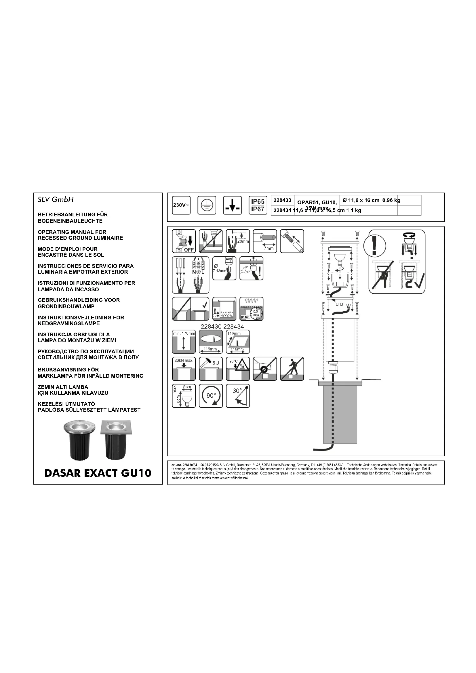 Installation de la lampe Mettez la lampe en la tournant un peu dans le sens des aiguilles d’une montre dans la douille. Réinstallez la lampe en effectuant ces étapes dans le sens inverse. Vérifiez que le joint est bien fixé au couvercle supérieur. La surface du joint doit être propre. Vissez en croix les vis du hublot ou de l’anneau de maintien pour garantir une charge régulière du joint. Fixez bien le pot en plastique dans le sol. Vérifiez le bon fonctionnement et l’attache correcte du luminaire! numéro d’article 228430/34 © 26.05.2015 SLV GmbH, Daimlerstr. 21-23, 52531 Übach-Palenberg, Germany, Tel. +49 (0)2451 4833-0 Les détails techniques sont sujet à des changements.ESPAÑOL