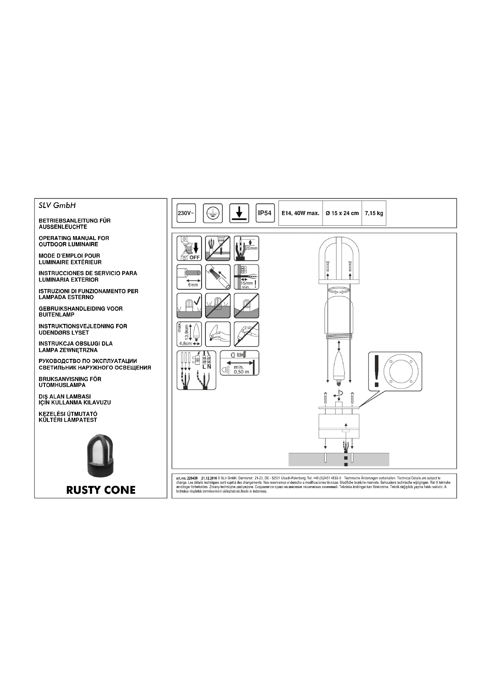 - Veillez à ce que le joint soient bien mis. Vissez en croix les vis du hublot ou de l’anneau de maintien pour garantir une charge régulière du joint. Vérifiez le bon fonctionnement et l’attache correcte du luminaire! numéro d’article 229430 © 21.12.2016 SLV GmbH, Daimlerstr. 21-23, DE - 52531 Übach-Palenberg, Tel. +49 (0)2451 4833-0 Les détails techniques sont sujet à des changements.ESPAÑOL
