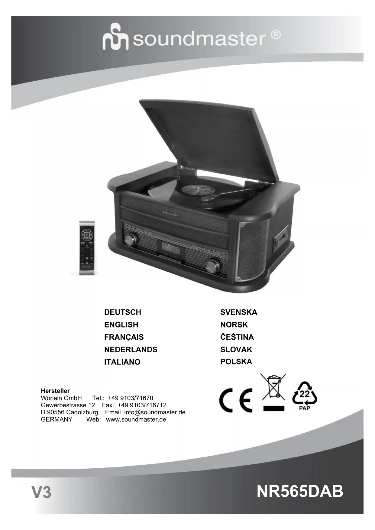 La version actuelle du manuel d’instructions peut être téléchargée à l’adresse www.soundmaster.de Modifications techniques et fautes d’impression réservées. Copyright de Wörlein GmbH, 90556 Cadolzburg, www.soundmaster.de Duplication uniquement avec l’autorisation de Woerlein GmbHVeiligheids-, milieu- en instellingsaanwijzingen