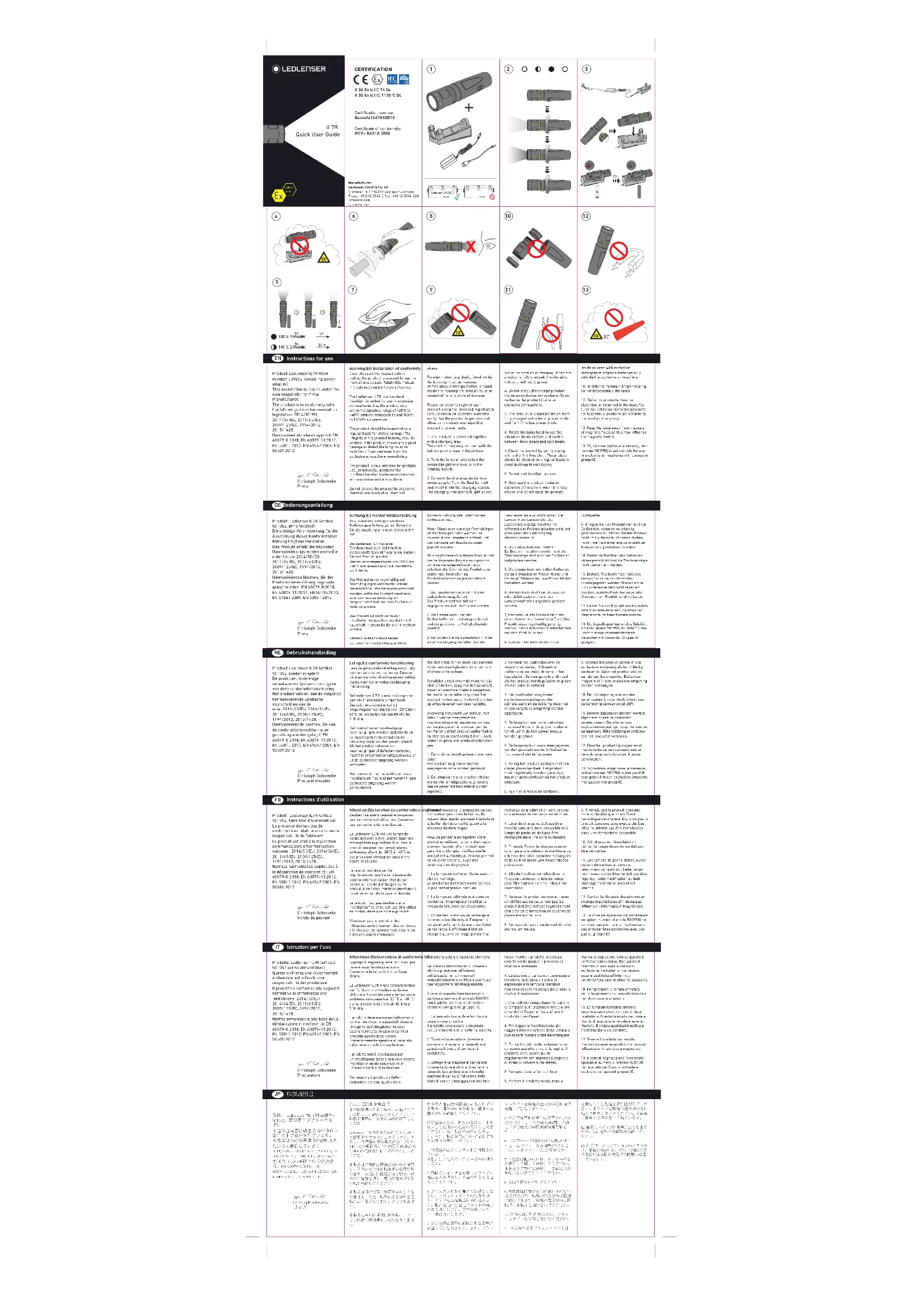 Let op:EU conformiteitsverklaring Veuillez lire attentivement et respecter ces instructions d'utilisation. Conservez ces instructions dans un lieu sûr. La Ledlenser iL7R est une lampe de poche destinée à être utilisée dans des atmosphères explosibles. N'utilisez le produit que pour des températures ambiantes allant de -20°C à +40°C et des pressions atmosphériques entre 80kPa et 110kPa. Le produit doit être vérifié régulièrement quant à la présence de détériorations et au bon état de son boîtier. En cas de dommages sur le produit, il doit être immédiatement mis à l'arrêt et extrait de la zone explosible. Le produit n'est pas destiné à une installation fixe et ne doit pas être utilisé en continu dans une zone explosible. N'exposez pas le produit à des influences environnementales extrêmes, à la chaleur, au rayonnement solaire ou à des influences chimiques. Produit : Ledlenser iL7R (article 501052, sans bloc d'alimentation) La présente déclaration de conformité est établie sous la seule responsabilité du fabricant Le produit satisfait à la législation communautaire d'harmonisation suivante : 2014/30/EU, 2014/34/EU, 2011/65/EU, 2009/125/EC, 1194/2012, 2015/1428. Normes harmonisées appliquées à la déclaration de conformité : EN 60079-0:2018, EN 60079-11:2012, EN 55015:2013, EN 61547:2009, EN 50581:2012 Christoph Schwenke Fondé de pouvoir