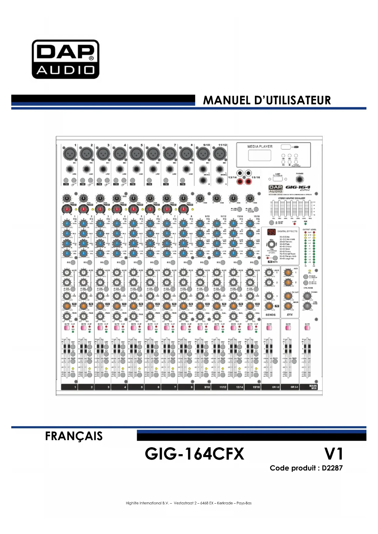 Réclamations Le client est tenu de vérifier les marchandises livrées dès leur réception, afin de détecter tout problème ou défaut visible potentiel. Ces vérifications peuvent également avoir lieu après que nous l’ayons averti de la mise à disposition des marchandises. Le transporteur est responsable de tous les dommages ayant eu lieu durant le transport ; par conséquent, les dommages doivent être signalés au transporteur à réception de la marchandise. En cas de dégât subi lors du transport, le client doit en informer l’expéditeur et lui soumettre toute réclamation. Signaler les dommages résultant du transport dans un délai d’un (1) jour suivant la réception de la livraison. Toujours s’acquitter de l’affranchissement postal des biens retournés. Accompagner les marchandises renvoyées d’une lettre définissant les raisons du renvoi. S’ils ne sont pas affranchis, les biens retournés seront refusés, sauf accord contraire par écrit. Nous faire parvenir toutes les réclamations nous concernant par écrit ou par fax, dans un délai de 10 jours suivant la réception de la facture. Une fois cette période écoulée, les réclamations ne seront plus traitées. Les réclamations signalées dans les délais seront uniquement considérées si le client s’est dûment conformé à toutes les sections du contrat auquel se rapportent les obligations, quelle qu’en soit la nature.7 GIG-164CFX Code produit : D2287 Description de l’appareil Caractéristiques La DAP GIG-164CFX est une table de mixage compacte professionnelle d’une excellente qualité et d’une fiabilité optimisée. Elle est idéale pour les concerts, l’enregistrement et les installations audio fixes. Préamplis micro à très faible bruit dotés d’alimentation fantôme +48 V. 10 canaux micro avec prise XLR et 8 prises de ligne symétriques. E/S et de contrôle du compresseur. Filtre passe-bas pour prise micro. 4 potentiomètres auxiliaires Afficheur de niveaux à 12 segments très précis 2 canaux stéréo avec entrée XLR mono et jack TRS. Canaux 2 entrées stéréo avec prise jack RCA. Égalisation à 3 bandes à MID sélectionnable et de témoins LED d’écrêtage sur chaque canal de microphone. Canaux stéréo pourvus chacun d’une égalisation à 4 bandes et de témoins LED d’écrêtage. 4 envois AUX POST/PRE par canal pour le contrôle ou les effets externes et internes. 4 potentiomètres de niveau AUX Retour EFX sur AUX, MAIN et prise jack correspondante. Fonction Mute et PFL pour chaque canal. Fader 60 mm pour le contrôle du niveau. Assignation du bus GR1-2, GR3-4 et Main L/R pour chaque canal. Sorties XLR & TRS symétriques pour le mixage principal. Effet DSP 24 bits avec 100 presets. Port USB pour connecter la GIG-164CFX à votre PC/ordinateur portable. Lecteur intégré Alimentation à commutation interne 100 - 240 V pour une plus grande flexibilité. Fusible T1, 25AL/250 V Dimensions : 500 x 435 x 91 mm (l x L x H) Poids : 6,75 kg. Présentation8 GIG-164CFX Code produit : D2287