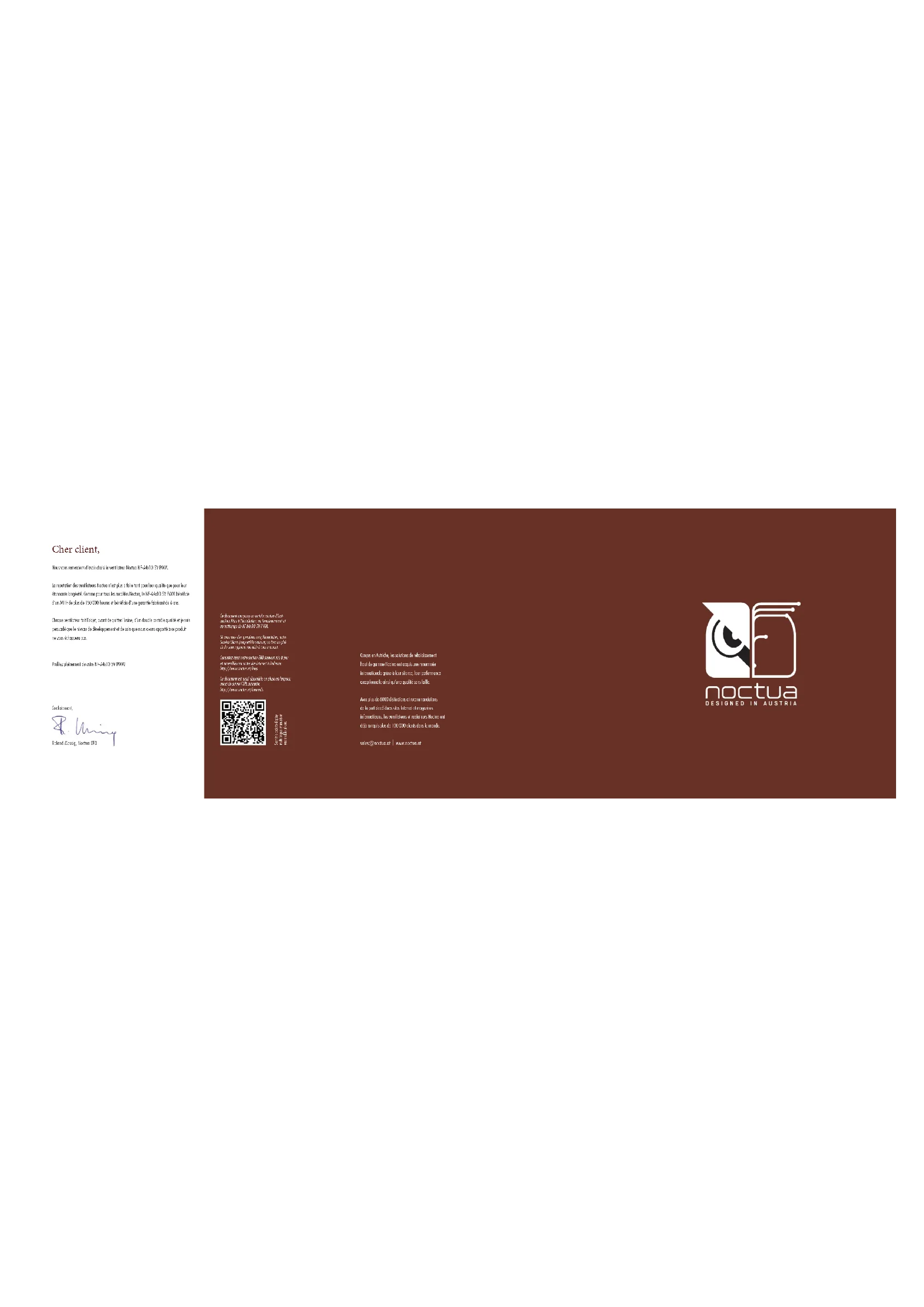 Cordialement, Roland Mossig, Noctua CEO Ce document comporte un certain nombre d’inst- ructions liées à l’installation, au fonctionnement et au nettoyage du NF-A4x10 5V PWM. Si vous avez des questions complémentaires, notre Service Client (support@noctua.at) se fera un plai- sir de vous apporter son aide à tout moment. Consultez aussi notre section FAQ souvent mis à jour et accessibles sur notre site internet à l’adresse: http://www.noctua.at/faqs Ce document est aussi disponible en plusieurs langues; merci de suivre l’URL suivante: http://www.noctua.at/manuals Scan this code to display multi-lingual manuals on your mobile phone. Conçus en Autriche, les solutions de refroidissement haut de gamme Noctua ont acquis une renommée internationale grâce à leur silence, leur performance exceptionnelle ainsi qu’une qualité sans faille. Avec plus de 6000 distinctions et recommandations de la part de célèbres sites Internet et magazines informatiques, les ventilateurs et radiateurs Noctua ont déjà conquis plus de 100 000 clients dans le monde. sales@noctua.at