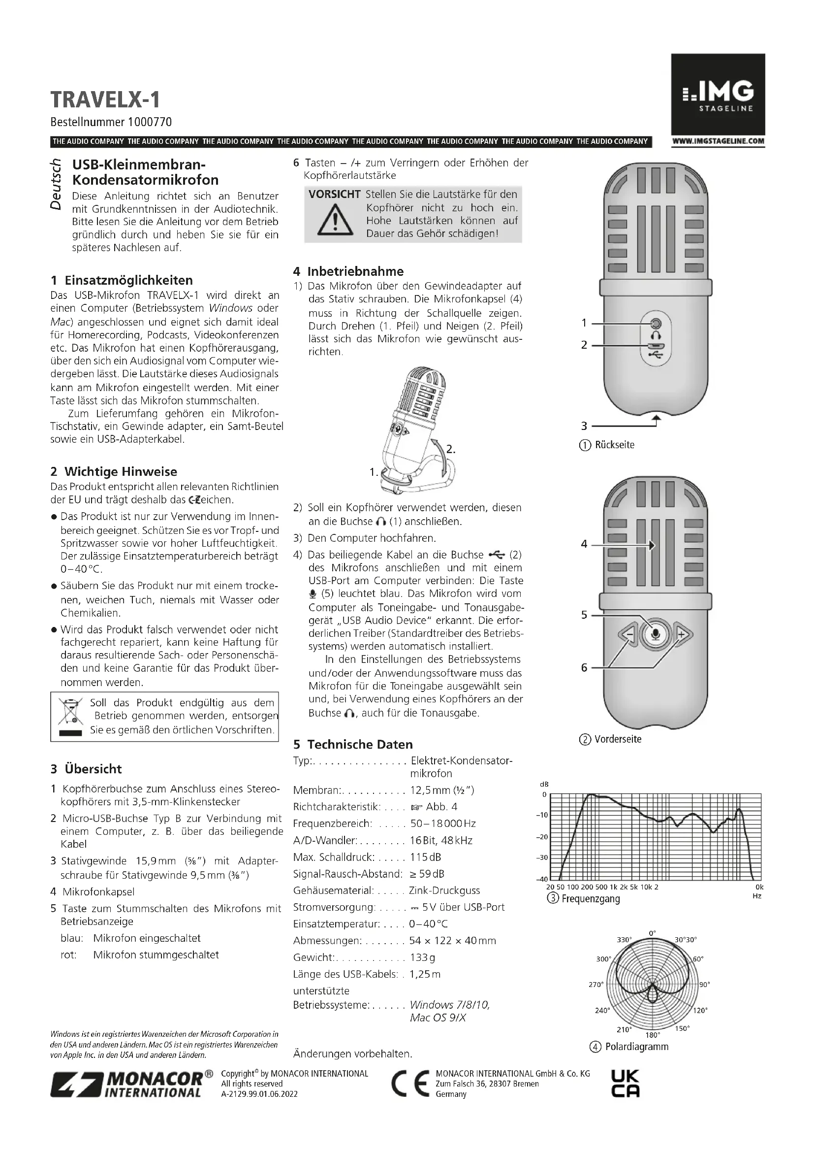 30°30° 60° 90° 120° 150° 180° 210° 240° 270° 300° 330° TRAVELX-1 Référence numérique 1000770 Microphone à condensateur, petite membrane, USB Cette notice s’adresse aux utilisateurs avec des connaissances de base en audio. Veuillez lire la présente notice avant le fonctionne- ment et conservez-la pour pouvoir vous y reporter ultérieurement. 1 Possibilités d’utilisation Le microphone USB, TRAVELX-1, se branche direc- tement sur un ordinateur (système d’exploitation (Windows ou Mac) et est adapté pour l’enregistre- ment à domicile, les podcasts, conférences vidéo etc. Le microphone dispose d’une sortie casque qui permet de restituer un signal audio de l’or- dinateur. Le volume du signal audio se règle sur le microphone. Le son du micro se coupe via une touche. Un pied de micro de table, un adaptateur fi- leté, une sacoche en velours et un cordon adap- tateur USB sont livrés. 2 Conseils importants Le produit répond à toutes directives nécessaires de l’Union européenne et porte donc le symbole .