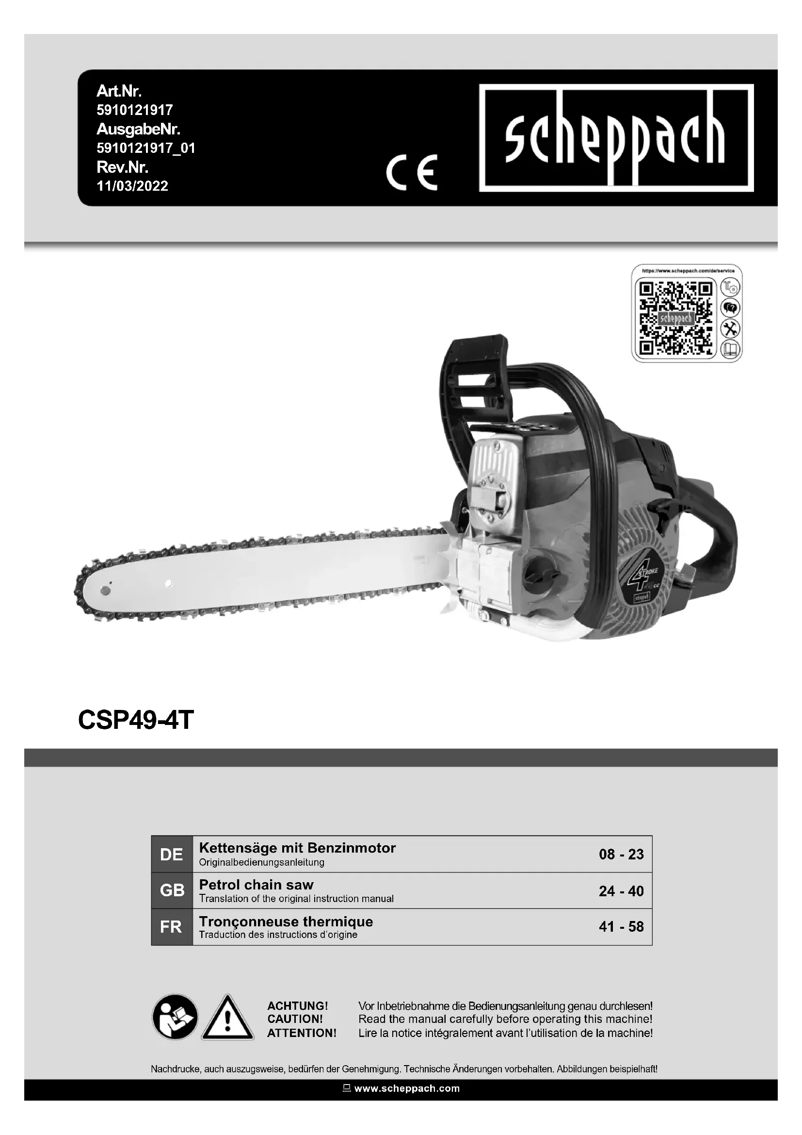 ATTENTION! Il est impératif de lire entièrement et attentivement cette notice et de respecter toutes les prescriptions concernant la sécurité avant la première utilisation ! La tronçonneuse à moteur doit être utilisée exclusivement par les personnes qui ont suivi une formation concernant son utilisation et les dangers associés ( « certicat de participa- tion à une formation des utilisateurs de tronçonneuses correspondant à la réglementation localement en vigueur ») ! Conservez soigneusement cette notice d’utilisation ! Remarque: Veillez tenir compte du fait que certaines réglementations nationales peuvent limiter l’utili- sation de la machine. www.scheppach.com
