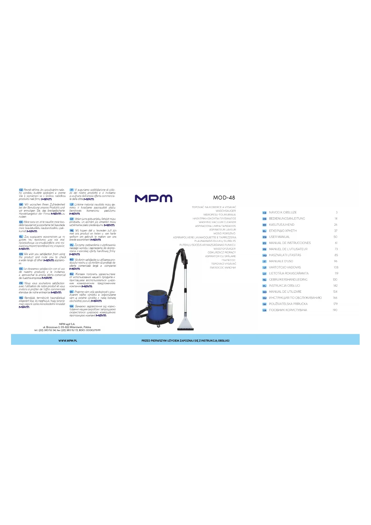 PARAMÈTRES DE COMMUNICATION DE LA TÉLÉCOMMANDE RADIO Gamme de fréquences 433.050-434.790 Mhz Puissance maximale ≤ 10dBm ATTENTION! L’entreprise MPM agd S.A. se réserve le droit d’apporter des modifi- cations techniques. Ce manuel a été traduit à la machine. En cas de doute, veuillez vous référer à sa version anglaise. Mise au rebut (déchets d’équipements électriques et électroniques) Le marquage sur le produit indique que le produit ne doit pas être jeté avec d’autres déchets ména- gers à la fin de son utilisation. Les équipements usagés peuvent avoir un effet néfaste sur l’environne- ment et la santé humaine en raison de la teneur potentielle en substances, mélanges et composants dangereux. Le mélange de déchets électroniques avec d’autres déchets ou leur démontage non pro- fessionnel peut entraîner un rejet de substances nocives pour la santé et l’environnement. L’appareil usé doit être déposé dans un point de collecte des déchets d’équipements électriques et électroniques. Afin d’obtenir des informations détaillées sur des lieux de collecte des déchets électriques et électroniques, l’utili- sateur doit contacter le point de collecte des déchets d’équipements municipaux ou l’usine de traitement des déchets d’équipements. DÉCLARATION DE CONFORMITÉ SIMPLIFIÉE DE L'UE MPM agd S.A. déclare par la présente que l'aspirateur laveur, modèle MOD-48, est conforme aux exigences et aux normes contenues dans les directives de l'Union euro