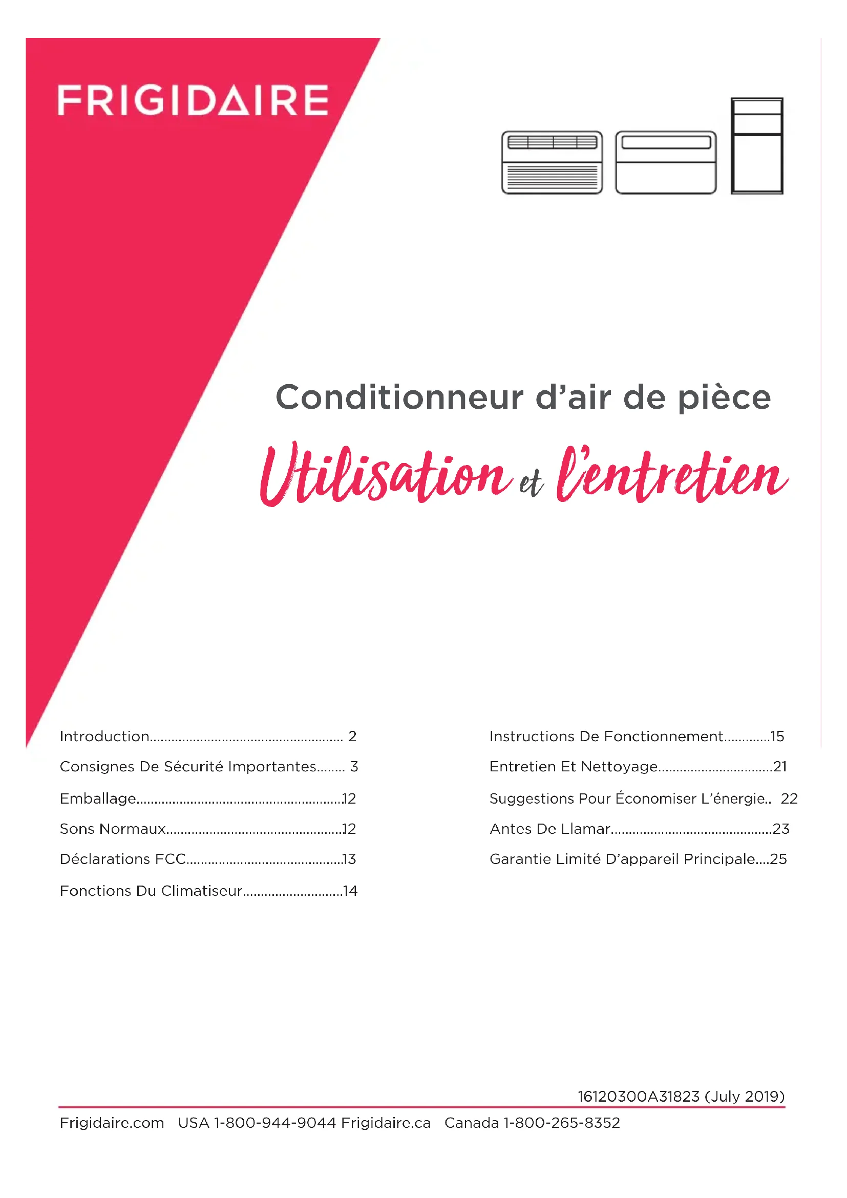 - L’appareil évacue de grandes quantités d’humidité de la pièce. Ceci est normal les jours très humides. Si ces solutions échouent, appelez le 1-800-944-9044(US)/1-800-265-8352 (Canada) pour le service Frigidaire.Exclusions Cette garantie ne couvre pas ce qui suit: AVIS DE NON-RESPONSABILITÉ SUR LES GARANTIES IMPLICITES; LIMITATIONS DES RECOURS Si vous avez besoin d’une réparation Canada