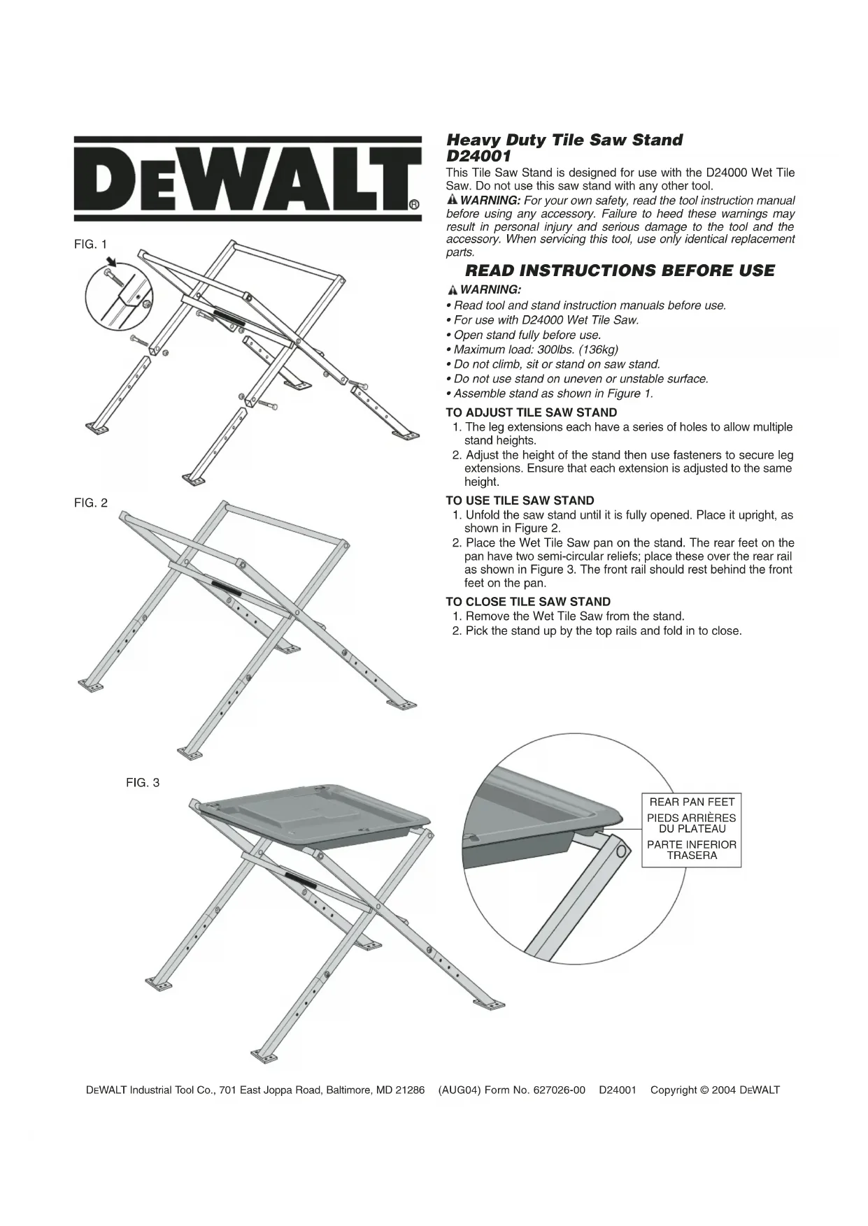 DU PLATEAU PARTE INFERIOR TRASERAEspañol Français Support de scie à carreaux a service intensif D24001 Ce support de scie à carreaux a été conçu pour être utilisé avec la scie à eau à carreaux D24000. Ne pas utiliser ce support de scie avec tout autre outil.
