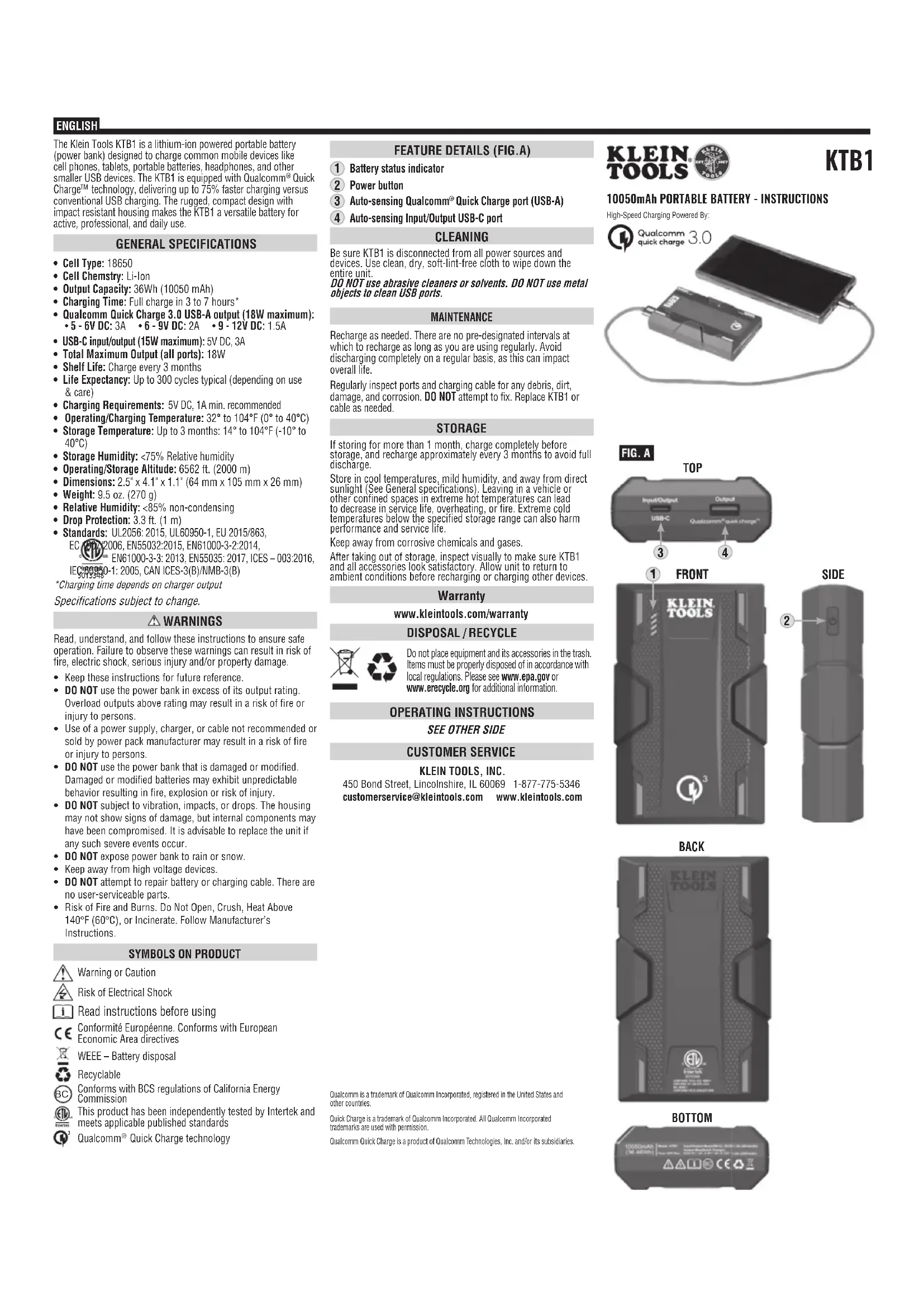 FRANÇAIS Qualcomm est une marque de commerce de QualcommIncorporated déposée aux États-Unis et dans d’autres pays. Quick Charge est une marque de commerce de QualcommIncorporated. Toutes les marques de commerce de QualcommIncorporated sont utilisées avec autorisation.Quick Charge est un produit de QualcommTechnologies, Inc. ou de ses filiales. Le chargeur portatifKTB1 de KleinTools, muni d’une batterie au lithium- ion, est conçu pour charger les appareils mobiles courants, comme des téléphones, des tablettes, des batteries portatives, des écouteurs et d’autres petits appareils alimentés par USB. Il est pourvu de la technologie Quick Charge