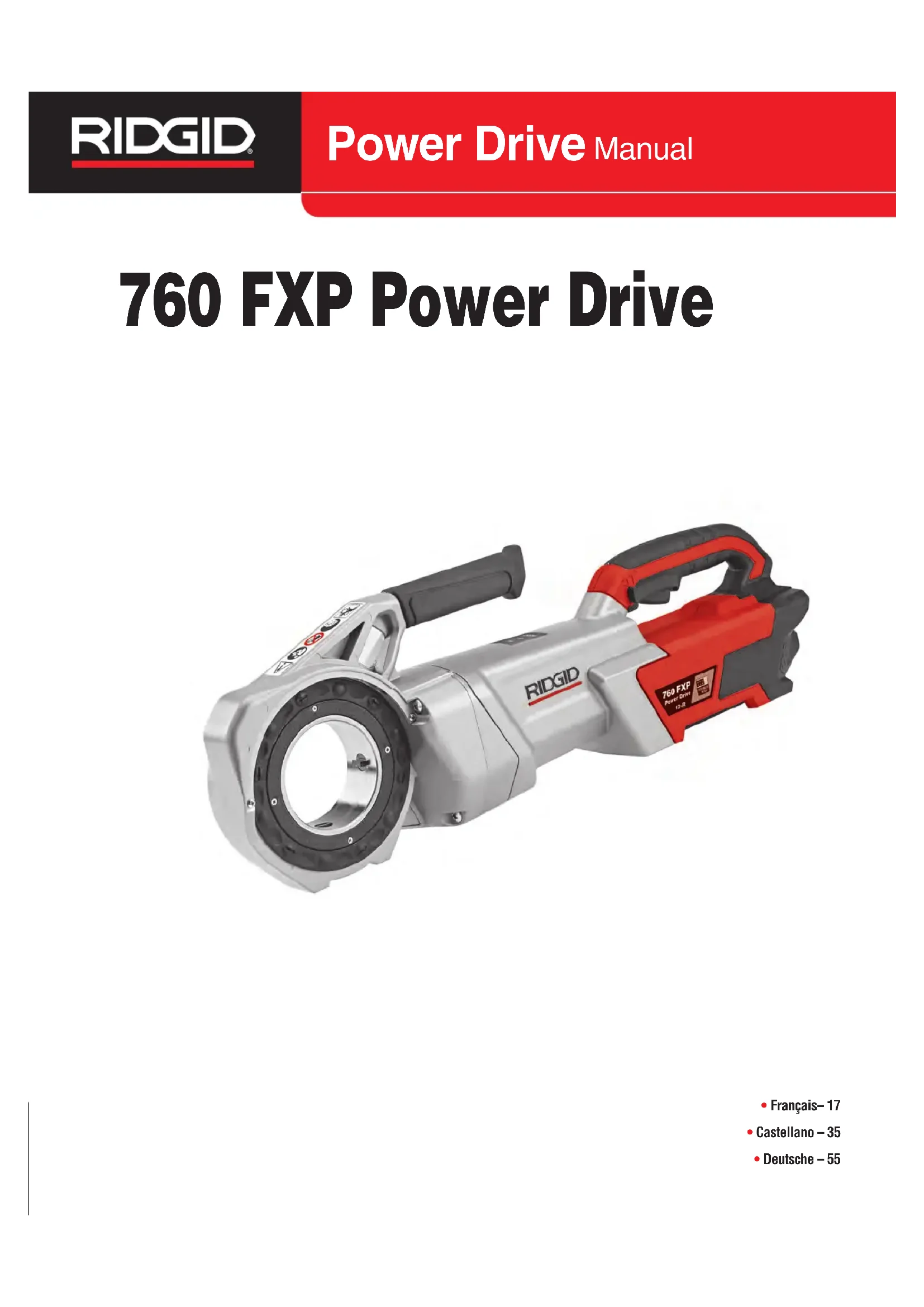 . La fiche de sécurité du produit est disponible sur RIDGID.com ou en consultant les services techniques de Ridge Tool en composant le (800) 519-3456 à partir des Etats-Unis ou du Canada, ou encore à rtctechservices@emerson.com. Accessoires AVERTISSEMENT Afin de limiter les risques d’accident grave, n’uti- lisez que les accessoires spécifiquement conçus et recommandés pour le système d’entraînement RIDGID 760 FXP Power Drive, tels que ceux-ci-après. Réf. CatalogueDescription70788 Bloc-piles li-ion RB-FXP40 de 4,0 Ah70793 Bloc-piles li-ion RB-FXP80 de 8,0 Ah Bloc-piles et adaptateurs ModèleRéf. CatalogueDescription760 FXP 12-R 42600 Adaptateur 770 pour 00-R (1/8" à 1") et 00-RB (¼" à 1")42605 Adaptateur 771 pour 0-R (1/8" à 1")42610 Adaptateur 772 pour 0-R (1/8" à 1¼")42615 Adaptateur 773 pour 111-R (1/8" à 1¼")42620 Adaptateur 774 pour carré de 15/16"760 FXP 11-R 39187 Bague à cliquet760 FXP 11-R and 760 FXP 12-R 45928 Stabilisateur n° 69274463 Malette de transport10883 Système de lubrification n° 418 avec 1 galon d’huile Nu-Clear22088 Huile de coupe en canette aérosol Extreme Performance16703 Etau sur trépied TRISTAND n° 425 pour tuyaux Ø 1/8" à 2½"36273 Etau sur trépied TRISTAND n° 460-6 pour tuyaux Ø 1/8" à 6"AVIS IMPORTANTAccionamiento motorizado 760 FXP Accionamiento motorizado ADVERTENCIA! Antes de utilizar este aparato, lea detenidamente su Manual del Operario. Pueden ocurrir descar-gas eléctricas, incendios y/o gra-ves lesiones si no se entienden y siguen las instrucciones de este manual. Accionamiento motorizado 760 FXP Apunte aquí y guarde el número de serie del producto; se encuentra en su placa de características.No. de serie999-995-242.10_REV A