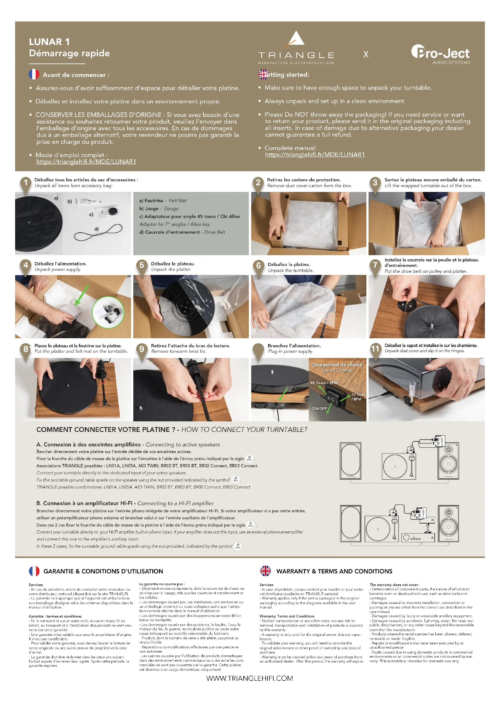 - Complete manual: https://trianglehi.fr/MDE/LUNAR1 Services- En cas de problème, merci de contacter votre revendeur ou votre distributeur national (disponible sur le site TRIANGLE) - La garantie ne s‘applique que si l‘appareil est emballé dans son emballage d‘origine selon les schémas disponibles dans le manuel d‘utilisation. Garantie : termes et conditions - Ni le transport ni aucun autre coût, ni aucun risque lié au retrait, au transport et à l‘installation des produits ne sont cou-verts par cette garantie. - Une garantie n‘est valable que pour le propriétaire d‘origine. Il n‘est pas transférable. - Pour valider votre garantie, vous devrez fournir la facture de vente originale ou une autre preuve de propriété et la date d‘achat. - La garantie doit être réclamée dans les deux ans suivant l‘achat auprès d‘un revendeur agréé. Après cette période, la garantie expirera.La garantie ne couvre pas : - Détérioration des composants, dont la nature est de s‘user ou de s‘épuiser à l‘usage, tels que les courroies d‘entraînement et les cellules. - Les dommages causés par une installation, une connexion ou un emballage incorrect ou toute utilisation autre que l‘utilisa-tion correcte décrite dans le manuel d‘utilisation. - Les dommages causés par des équipements annexes défec-tueux ou inadaptés. - Les dommages causés par des accidents, la foudre, l‘eau, la chaleur du feu, la guerre, les troubles publics ou toute autre cause échappant au contrôle raisonnable du fabricant. - Produits dont le numéro de série a été altéré, supprimé ou rendu illisible. - Réparations ou modications effectuées par une personne non autorisée - Les pannes causées par l‘utilisation de produits domestiques dans des environnements commerciaux ou à des échelles com-merciales ne sont pas couvertes par la garantie. Cette platine est destinée à un usage domestique uniquement.