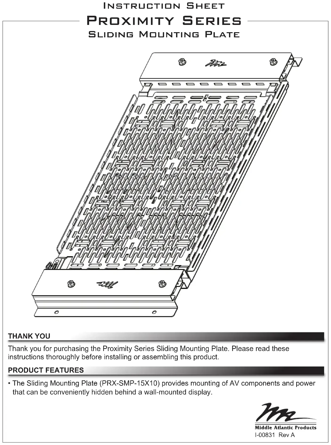 - N'utilisez que des accessoires spécifiés par le fabricant. AVERTISSEMENT: Cette produit est conçu pour être utilisé uniquement avec les produits et les poids maximum indiqué. unique- ment avec les produits et les poids maximaux indiqués. En cas d'utilisation avec d'autres produits ou des produits plus lourds que le poids maximal indiqué, le chariot peut devenir instable et causer des blessures. Le poids total de l'équipement ne doit pas dépasser 6.8 kg (15 lbs). WARNING: This product is intended for use only with the products and maximum weights indicated. Use with other products or products heavier than the maximum weights indicated may result in instability causing possible injury. Total equipment weight must not exceed 15 lbs. (6.80 kg). WEIGHT RATINGS Model Weight Rating 15 lbs. Maximum Total Rated LoadPRX-SMP-15X10Page 3 SUPPLIED COMPONENTS Sliding Mounting Plate