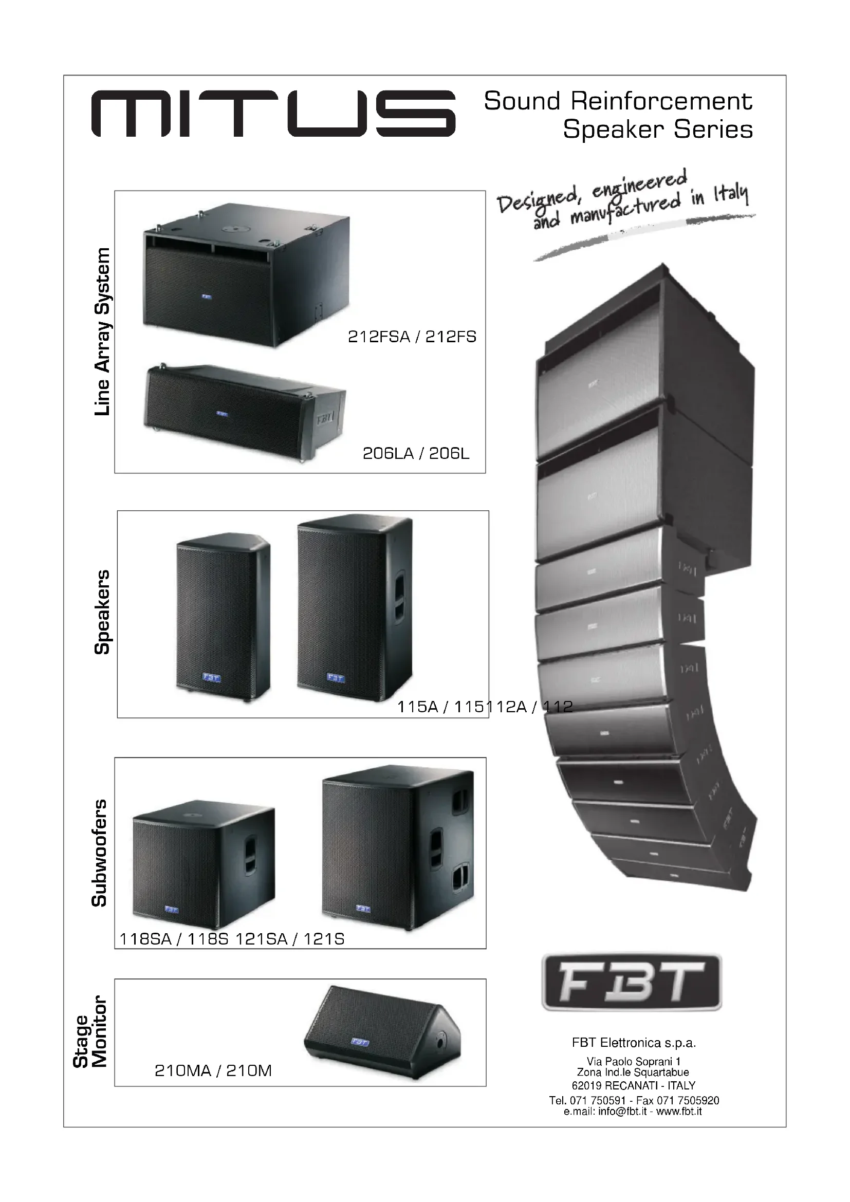 Les systèmes actifs MITUS présentent un module amplificateur en classe D à haute efficacité avec alimentateur de type « switching » mis en boîte dans uneenveloppesouspression enaluminium. Cette enveloppe permet de protéger la partie électronique de la poussière, d'éviter toute perte d'air des contrôles qui causerait des bruits ennuyeux, de maximiser la dissipation de la chaleur en exploitant même la ventilation du wooferet enévitant l'emploide ventilateursde refroidissement. Celaa permisde construireun amplificateurde 1200Wtrès léger. Dans les modèles 206LA/206L, ce module joue même le rôle de bâti pour la suspensionet permetle réglagede l'angled'inclinaison. Die aktiven MITUS Systeme verfügen über ein Verstärker Modul in Klasse D m i t e i n g e k a p s e l t e m S w i t c h i n g - N e t z g e r ä t a u s Aluminiumdruckgussgehäuse. Dies schützt die Elektronik vor Staub, vermeidet Luftverlust an den Regelungen, der lästigen Lärm produzieren würde, und maximiert den Wärmeverlust, indem auch die Wooferlüftung genutzt wird und zusätzliche Abkühlräder vermieden werden. All dies erlaubte die Verwirklichung eines sehr leichten 1200W Verstärkers. Bei den Modellen 206LA/206L dient das Modul auch als Tragestruktur für dieAufhängung und ermöglicht die Einstellung des Neigungswinkels. La série de sonorisation représente le résultat de l'expérience et de la passion pour la perfection de FBT. Il s'agit d'une gamme complète de diffuseurs2 voies pour applicationFOH, subwoofers, moniteur de plateauet « line array », en version bi-amplifiée et passive. Lors de leur emploi pour des performances « live », en tournée ou en installation fixe, ils seront appréciés par tout musicien et professionnel étant à la recherche de la meilleurequalité duson. est le modèle de pointe de la gamme ; un « line array » avec 2 woofers de 165mm et un driver avec bouche de 36mm couplé à un guide d'onde, conçu pour respecter les critères physiques de la source cylindrique idéale dans toute la portée audio. Avec son boîtier en polypropylène à injection de gaz et sa mécanique de suspension intégrée, MITUS 206LAest un grand résultat de l'élaboration mécanique et électronique de FBT. Par le logiciel de visée de FBT pour les ordinateurs, on peut simuler la distribution deSPLetla réponseen fréquencedans lazone d'écoute. est un subwoofer de 2x320mm, compact, avec une mécanique de suspension intégrée, étant parfait pour étendre les basses fréquences du MITUS 206LA en configuration « line array » suspendue ou parterre. Les modèles et , ayant respectivement un woofer de 460mm et un de 530mm, complètent la gamme de subwoofers ; ils s'intègrent parfaitement avec les satellites MITUS lors des performances « live » ou pour les installations fixes, en renforçant et en étendantla gamme basse avec le SPL élevé qu'ils offrent. Ils sont tous en multicouches de bouleauavec peinturenoire antirayures. et sont des diffuseurs bi-amplifiés FOH à 2 voies bons pour une vaste gamme d'applications, en particulier s'ils sont couplés aux subs MITUS. Ils assurent une qualité sonore étonnante lors de performances« live» oudans lesinstallations fixes. , avec son profil bas et élégante, est sans aucun doute le moniteur de plateau le plus avancé du point de vue technologique dans sa classe ; deux woofers de 250mm, dont un est coaxial, avec un driver de 36mm, assurent une fidélité très haute et une réserve dynamique pour toutesles performances« live» oules programmesTV. Toutela sérieMITUS estéquipée de: -haut-parleurs B&Ccustom FBTaunéodyme dequalité trèsélevée ; -driver àcompression B&Cde dernièregénération ; - module amplificateur en classe D à haute efficacité avec alimentateur de type « switching » mis en boîte dans une enveloppe sous pression en aluminium. - processeur de signal numérique DSP avec convertisseurs A/D - D/A au bruittrès faible; -connecteurs d'alimentationNeutrik Powercon« inet loopout »; - grande disponibilité d'accessoires et d'arrangements qui rendent la gammeMITUS trèsflexible etsimple àemployer ; - nouvelle poignée sous pression en aluminium avec une pièce en caoutchoucpermettant uneprise sureet confortable; - filet frontal robuste et anti-résonnant avec l'emploi d'un tissu synthétique deprotection inédit. MITUS MITUS 206LA MITUS 212FSA