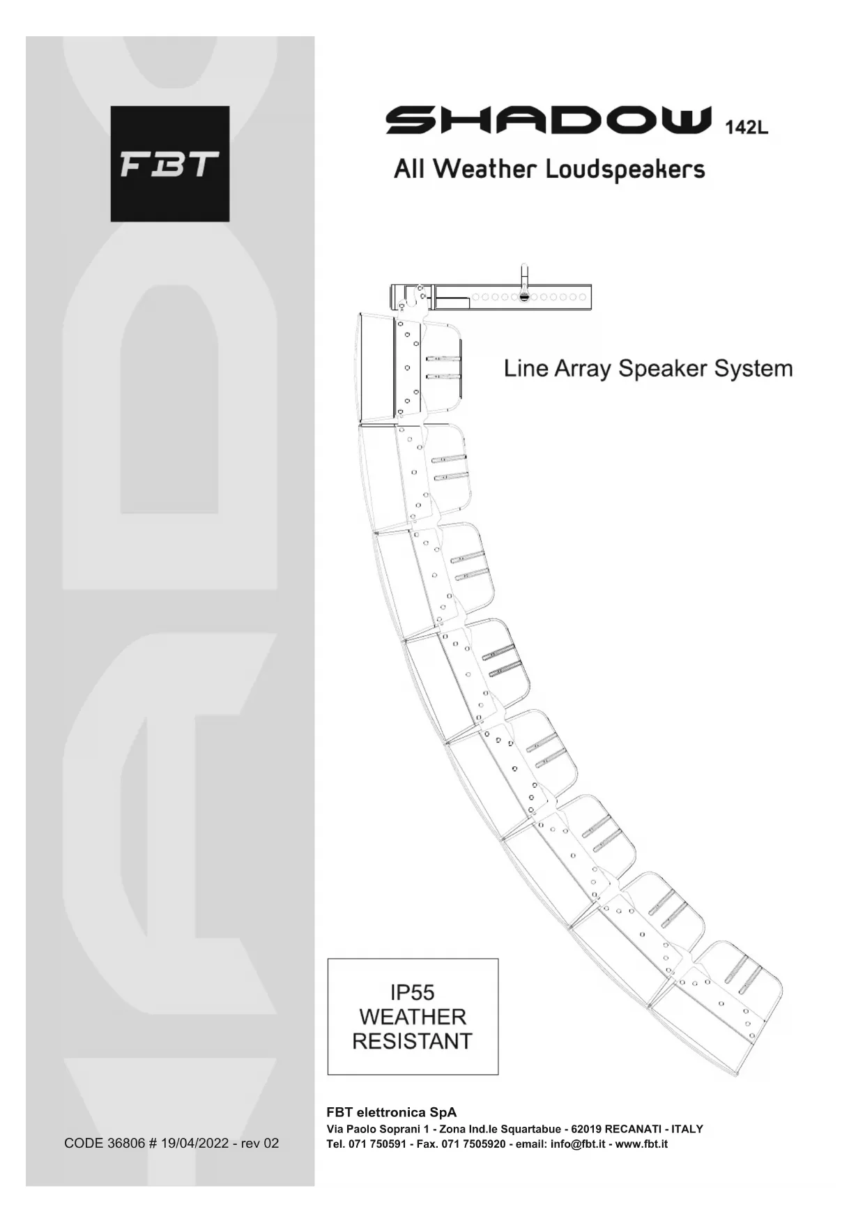 21DESCRIPTION La première consideràtion lors de la conception de la série SHADOW a été d'obtenir une résistance parfaite à l'eau. Pour cette raison, même la grille métallique de protection a été étudiée pour satisfaire cette exigence, la structure de celle-ci est formée de trois couches qui comportent une partie métallique perforée extérieure en acier inoxydable traitée avec une protection spéciale, une couche centrale de mousse réticulée et une couche formée par une maille spéciale en polyester hydrofuge. Les courbes et les angles arrondis du diffuseur SHADOW réduisent les réflexions acoustiques et les ondes stationnaires à l'intérieur du box en améliorant les prestations des basses fréquences et contribuent également à éviter la stagnation de l'eau sur l'enveloppe et la diffraction du vent. Les diffuseurs de la série SHADOW cont conçus pour l'utilisation intérieure et extérieure, grâce à une enveloppe en polyéthylène résistante aux rayons UV et avec un degré de protection IP55 contre les poussières et les jets d'eau.CARACTÉRISTIQUES TECHNIQUES La configuration Line Array fait du SHADOW 142L la solution idéale pour les centres de congrès, les stades, les arènas et bien d'autres installations en salle ou en plein air, qui nécessitent une reproduction du son full range et une longue portée sonore. Grâce à l'uniformité de la réponse en fréquence et à l'excellente efficience du produit, le design du haut-parleur à charge pavillonnaire garantit une excellente reproduction de la musique et une grande intelligibilité de la parole "parlée". Les haut-parleurs SHADOW de FBT sont entièrement projetés et réalisés en Italie, ce qui ajoute une touche esthétique élégante et séduisante à un système hautement technologique, aux standards de qualité excellents. SHADOW 142L est un système de haut-parleurs à deux voies full range résistant aux intempéries, avec des performances élevées et une efficience maximum, pour une vaste gamme d'applications professionnelles en salle et en plein air. Le cabinet de ce haut-parleur est constitué par un caisson monobloc en polyéthylène rotomoulé entièrement traité anti- UV et produit dans le respect des standards les plus sévères prévus pour la classe de protection IP55.DIMENSIONS 615 mm 502 mm 415 mm 430 mmINSTALLATION ACCESSOIRES