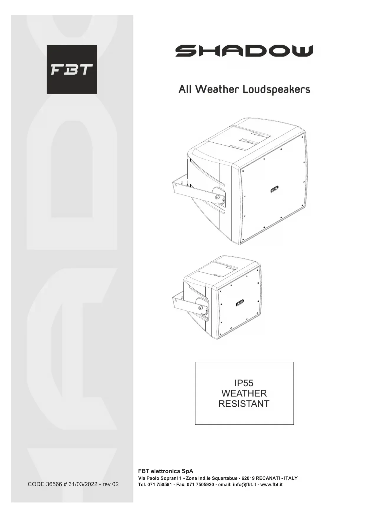 CONNECTIONS LAYOUT@21 ATTENTION22 DESCRIPTION Les diffuseurs de la série SHADOW sont conçus pour l'utilisation intérieure et extérieure, grâce à une enveloppe en polyéthylène résistante aux rayons UV et avec un degré de protection IP55 contre les poussières et les jets d'eau. Les courbes et les angles arrondis du diffuseur SHADOW réduisent les réflexions acoustiques et les ondes stationnaires à l'intérieur du box en améliorant les prestations des basses fréquences et contribuent également à éviter la stagnation de l'eau sur l'enveloppe et la diffraction du vent. Pour cette raison, même la grille métallique de protection a été étudiée pour satisfaire cette exigence, la structure de celle-ci est formée de trois couches qui comportent une partie métallique perforée extérieure en acier inoxydable traitée avec une protection spéciale, une couche centrale de mousse réticulée et une couche formée par une maille spéciale en polyester hydrofuge. La première considération lors de la conception de la série SHADOW a été d'obtenir une résistance parfaite à l'eau.23
