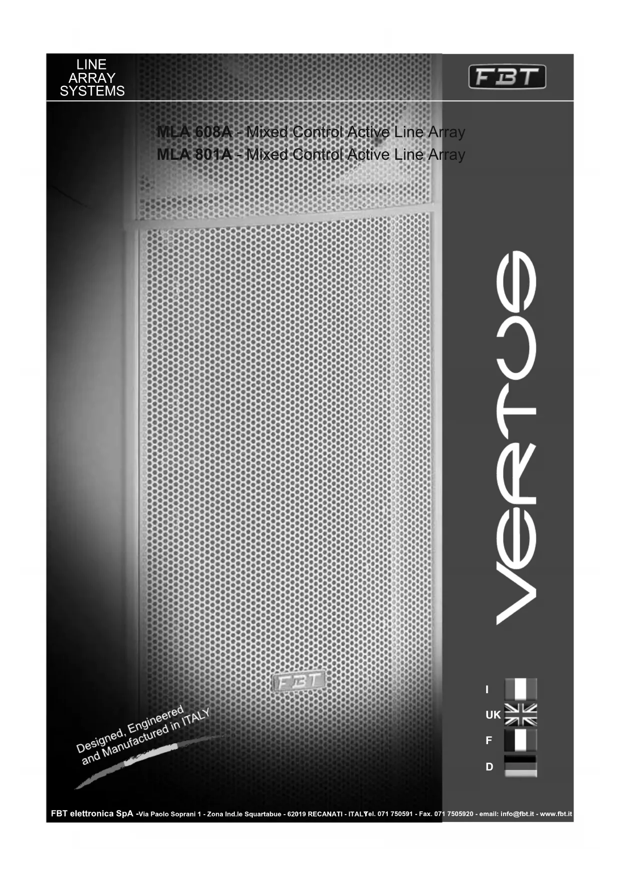 Téléchargez la notice de votre Haut-parleur au format PDF gratuitement ! Retrouvez votre notice VERTUS MLA 608A - FBT et reprennez votre appareil électronique en main. Sur cette page sont publiés tous les documents nécessaires à l'utilisation de votre appareil VERTUS MLA 608A de la marque FBT.