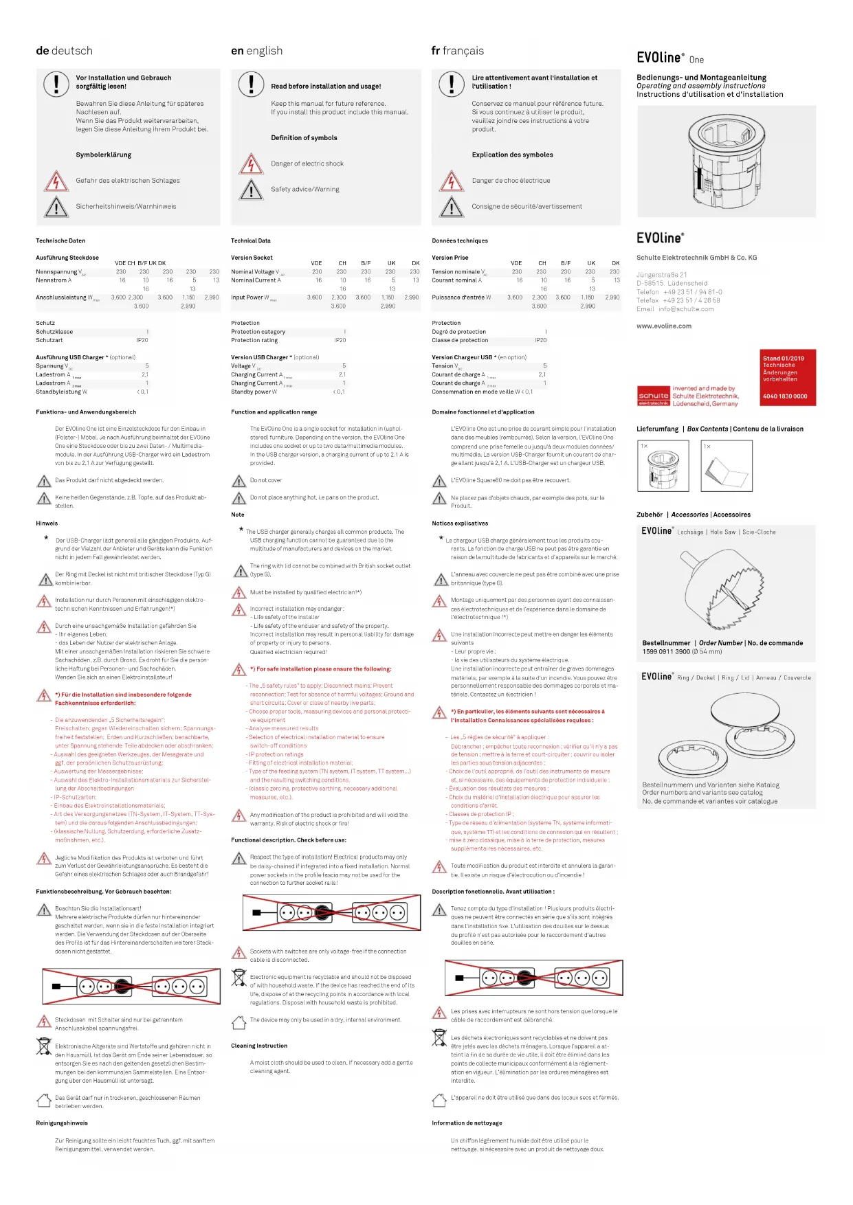 - Le chargeur USB charge généralement tous les produits cou- rants. La fonction de charge USB ne peut pas être garantie en raison de la multitude de fabricants et d‘appareils sur le marché.L‘anneau avec couvercle ne peut pas être combiné avec une prise britannique (type G).Montage uniquement par des personnes ayant des connaissan-ces électrotechniques et de l‘expérience dans le domaine de l‘électrotechnique !*)Une installation incorrecte peut mettre en danger les éléments suivants- Leur propre vie ;- la vie des utilisateurs du système électrique. Une installation incorrecte peut entraîner de graves dommages matériels, par exemple à la suite d‘un incendie. Vous pouvez être personnellement responsable des dommages corporels et ma-tériels. Contactez un électricien !*) En particulier, les éléments suivants sont nécessaires à l‘installation Connaissances spécialisées requises : - Les „5 règles de sécurité“ à appliquer : Débrancher ; empêcher toute reconnexion ; vérier qu‘il n‘y a pas de tension ; mettre à la terre et court-circuiter ; couvrir ou isoler les parties sous tension adjacentes ;- Choix de l‘outil approprié, de l‘outil des instruments de mesure et, si nécessaire, des équipements de protection individuelle ;- Évaluation des résultats des mesures ;- Choix du matériel d‘installation électrique pour assurer les conditions d‘arrêt. - Classes de protection IP ;- Type de réseau d‘alimentation (système TN, système informati-que, système TT) et les conditions de connexion qui en résultent ;- mise à zéro classique, mise à la terre de protection, mesures supplémentaires nécessaires, etc.Toute modication du produit est interdite et annulera la garan-tie. Il existe un risque d‘électrocution ou d‘incendie ! Description fonctionnelle. Avant utilisation :Tenez compte du type d‘installation ! Plusieurs produits électri-ques ne peuvent être connectés en série que s‘ils sont intégrés dans l‘installation xe. L‘utilisation des douilles sur le dessus du prolé n‘est pas autorisée pour le raccordement d‘autres douilles en série.Les prises avec interrupteurs ne sont hors tension que lorsque le câble de raccordement est débranché.Les déchets électroniques sont recyclables et ne doivent pas être jetés avec les déchets ménagers. Lorsque l‘appareil a at-teint la n de sa durée de vie utile, il doit être éliminé dans les points de collecte municipaux conformément à la réglement-ation en vigueur. L‘élimination par les ordures ménagères est interdite.L‘appareil ne doit être utilisé que dans des locaux secs et fermés.Information de nettoyageUn chiffon légèrement humide doit être utilisé pour le nettoyage, si nécessaire avec un produit de nettoyage doux.Technische Daten Ausführung SteckdoseVDE CH B/F UK DKNennspannung V