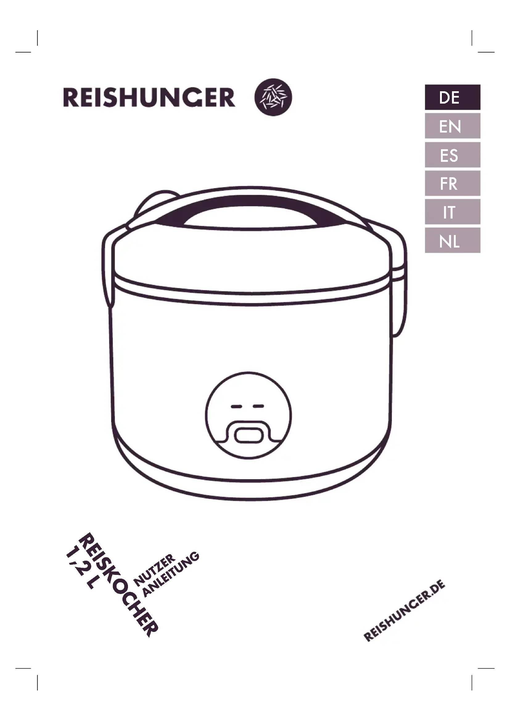 Lisez attentivement toutes les instructions d‘utilisation. Retirez tous les matériaux d‘emballage et vériez que toutes les pièces et accessoires soient en parfait état. Lavez la cuillère à riz, le verre doseur et la cuve intérieure dans de l‘eau savonneuse chaude et séchez-les soigneusement. Nous vous recommandons de faire bouillir de l‘eau dans le cuiseur pendant 20 minutes avant la première cuisson. Ce mode d‘emploi et autres informations de sécurité sont constamment révisés et sont toujours disponibles dans leur version actualisée à l‘adresse : reishunger. de/anleitung. Il est recommandé de télécharger la dernière version et de la lire attentivement avant d‘utiliser l‘appareil pour la première fois. Les appareils électriques usagés doivent être recyclés de manière adéquate par leur propriétaire et séparé- ment des ordures ménagères. Apportez l‘appareil à un point de collecte des déchets ou à un revendeur qui peut s‘en charger pour vous. L‘élimination incorrecte des appareils électriques peut avoir des conséquences négatives pour l‘environnement et la santé. N° de modèle : RCP–30 Voltage / Tension : 220 – 240 V