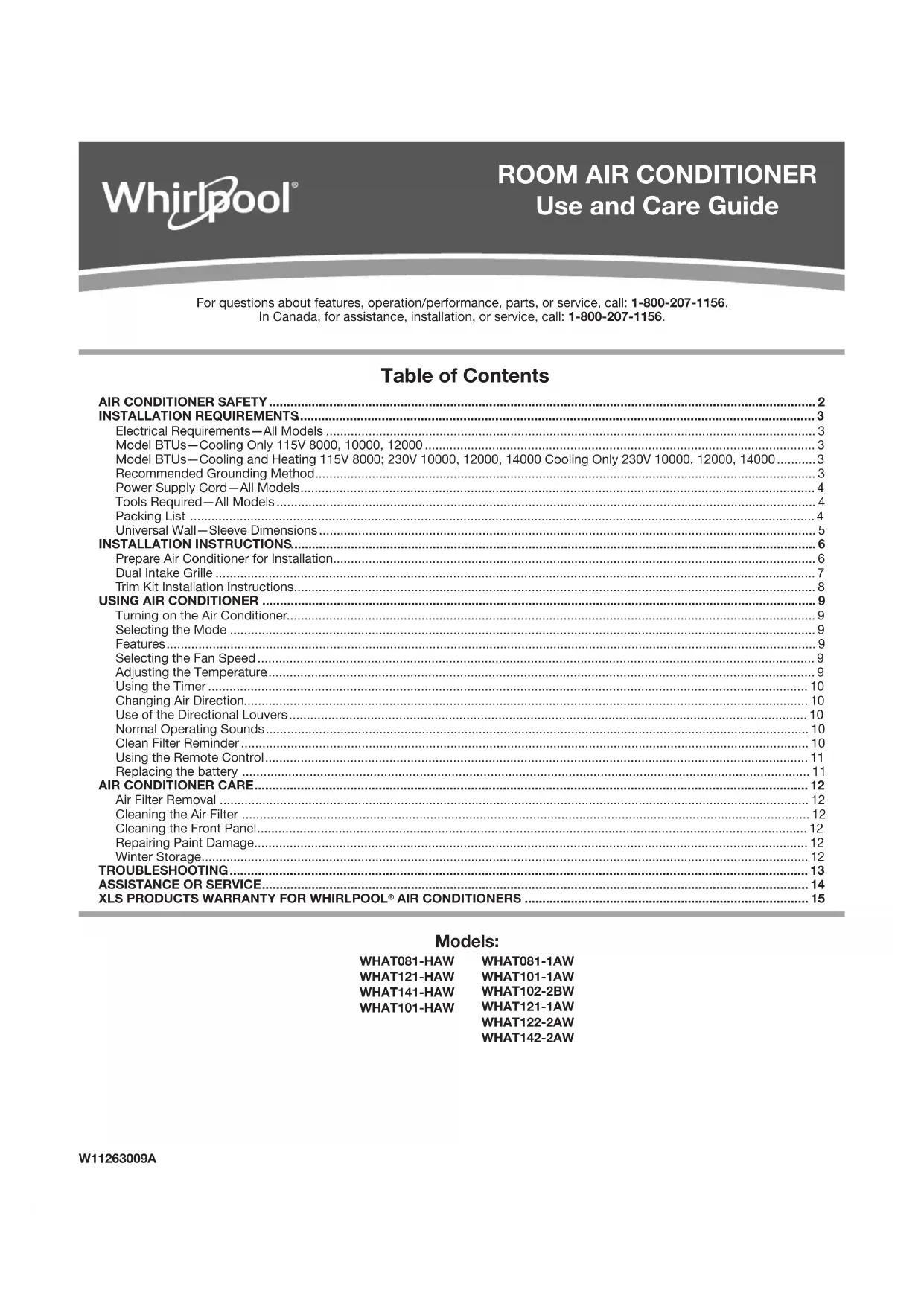 9. Enlèvement et réinstallations de votre appareil si celui-ci est installé dans un endroit inaccessible ou n’est pas installé conformément aux instructions d’installation fournies. CLAUSE D’EXONÉRATION DE RESPONSABILITÉ AU TITRE DES GARANTIES IMPLICITES; LIMITATION DES RECOURS LE SEUL ET EXCLUSIF RECOURS DU CLIENT DANS LE CADRE DE LA PRÉSENTE GARANTIE LIMITÉE CONSISTE EN LA RÉPARATION PRÉVUE CI-DESSUS. LES GARANTIES IMPLICITES, Y COMPRIS LES GARANTIES APPLICABLES DE QUALITÉ MARCHANDE OU D’APTITUDE À UN USAGE PARTICULIER, SONT LIMITÉES À UN AN OU À LA PLUS COURTE PÉRIODE AUTORISÉE PAR LA LOI. XLS PRODUCTS N’ASSUME AUCUNE RESPONSABILITÉ POUR LES DOMMAGES FORTUITS OU INDIRECTS. CERTAINES JURIDICTIONS NE PERMETTENT PAS L’EXCLUSION OU LA LIMITATION DES DOMMAGES FORTUITS OU INDIRECTS, OU LES LIMITATIONS DE LA DURÉE DES GARANTIES IMPLICITES DE QUALITÉ MARCHANDE OU D’APTITUDE ONT UN USAGE PARTICULIER, DE SORTE QUE CES EXCLUSIONS OU LIMITATIONS PEUVENT NE PAS S’APPLIQUER DANS VOTRE CAS. CETTE GARANTIE VOUS CONFÈRE DES DROITS JURIDIQUES SPÉCIFIQUES ET VOUS POUVEZ ÉGALEMENT JOUIRD’AUTRES DROITS QUI PEUVENT VARIER D’UNE JURIDICTION À UNE AUTRE. À l’extérieur du Canada et des 50 États des États-Unis, cette garantie ne s’applique pas. Contacter votre marchand XLS Products autorisé pour déterminer si une autre garantie s’applique. Si vous avez besoin de service, voir d’abord la section “Dépannage” du Guide d’utilisation et d’entretien. Après avoir vérié la section “Dépannage”, de l’aide supplémentaire peut être trouvée en vériant la section “Assistance ou service” ou en appelant XLS Products. Aux États-Unis, composez le 1800207-1156. Au Canada, composer le 1800207-1156. Conserver ce manuel et le reçu de vente au même endroit pour référence ultérieure. Pour un entretien ou une réparation sous garantie, un document attestant de la date d’achat ou d’installation doit être fourni. Inscrivez les renseignements suivants au sujet de votre climatiseur pour mieux vous aider à obtenir assistance ou réparation en cas de besoin. Vous devrez fournir le numéro de modèle et le numéro de série au complet. Vous trouverez ces renseignements sur la plaque signalétique située sur le produit. Nom du revendeur ________________________________________ Adresse __________________________________________________ Numéro de téléphone ______________________________________ Numéro de modèle ________________________________________ Numéro de série __________________________________________ Date d’achat ______________________________________________Si tiene preguntas respecto a características, funcionamiento o rendimiento, piezas o servicio técnico, llame al: 1-800-207-1156. En Canadá, para obtener asistencia, instalación o servicio técnico, llame al: 1-800-207-1156. Índice WHAT081-HAW WHAT121-HAW WHAT141-HAW WHAT101-HAW