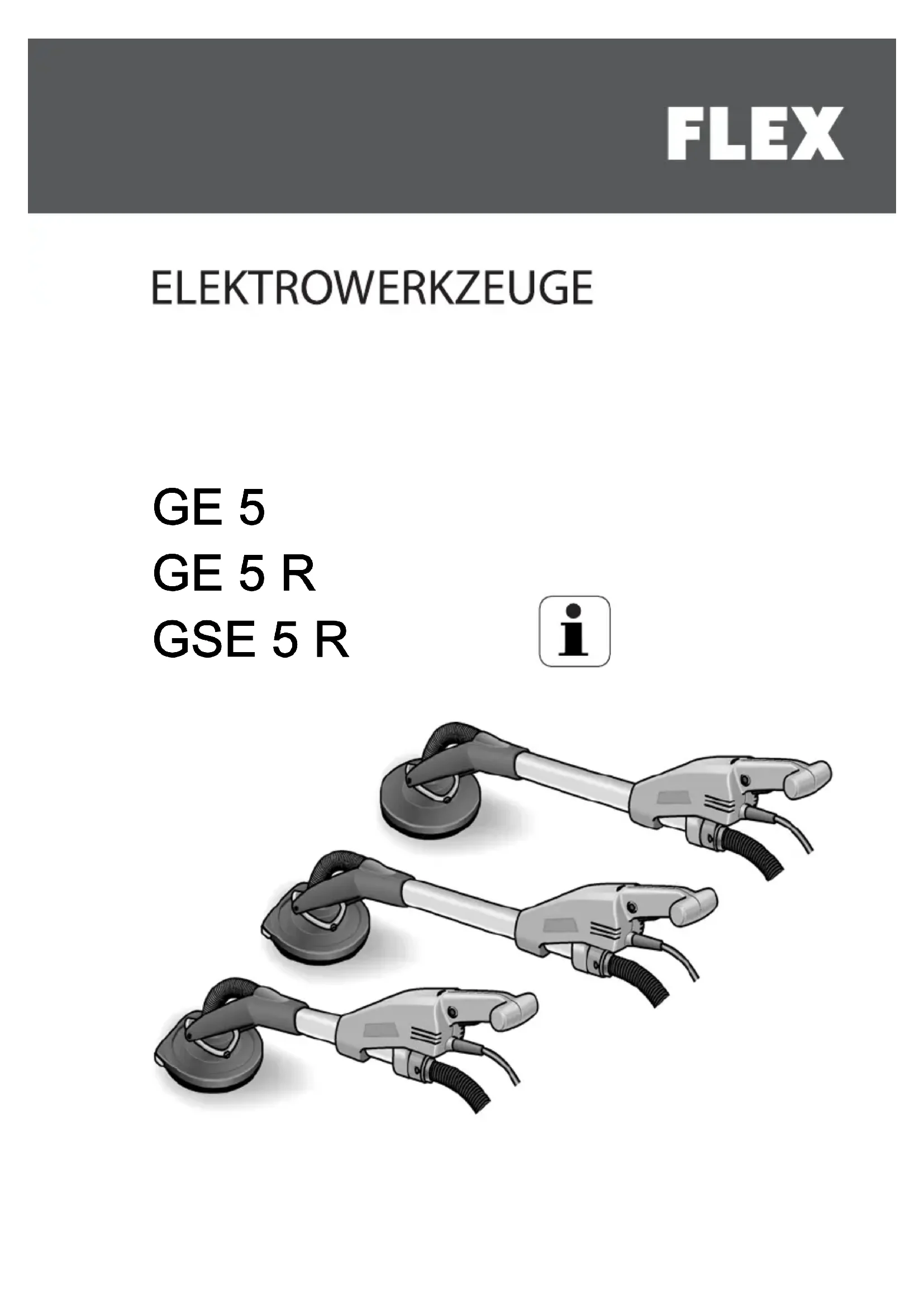 dans un état technique et de sécurité parfait. Supprimez immédiatement tout dérangement susceptible de compromettre la sécurité. Conformité d’utilisation La ponceuse murale GE 5/GE 5 R/GSE 5 R est destinée – aux utilisations professionnelles dans l’industrie et l’artisanat, – à poncer les murs et les plafonds, dans des locaux et en plein air, – à poncer l’enduit aux jointures des panneaux de construction sèche, – à l’emploi avec des outils proposés par FLEX comme accessoires de ces appareils et homologués pour tourner à une vitesse d’au moins 1750 tr/mn. L’utilisation de disques de tronçonnage, à dégrossir, disques de meulage à éventail ou de brosses à crins métalliques n’est pas permise. Avant d’utiliser la ponceuse murale GE 5/GE 5 R/GSE 5 R, il faut lui raccorder un aspi-rateur de classe M.GE 5 / GE 5 R / GSE 5 R