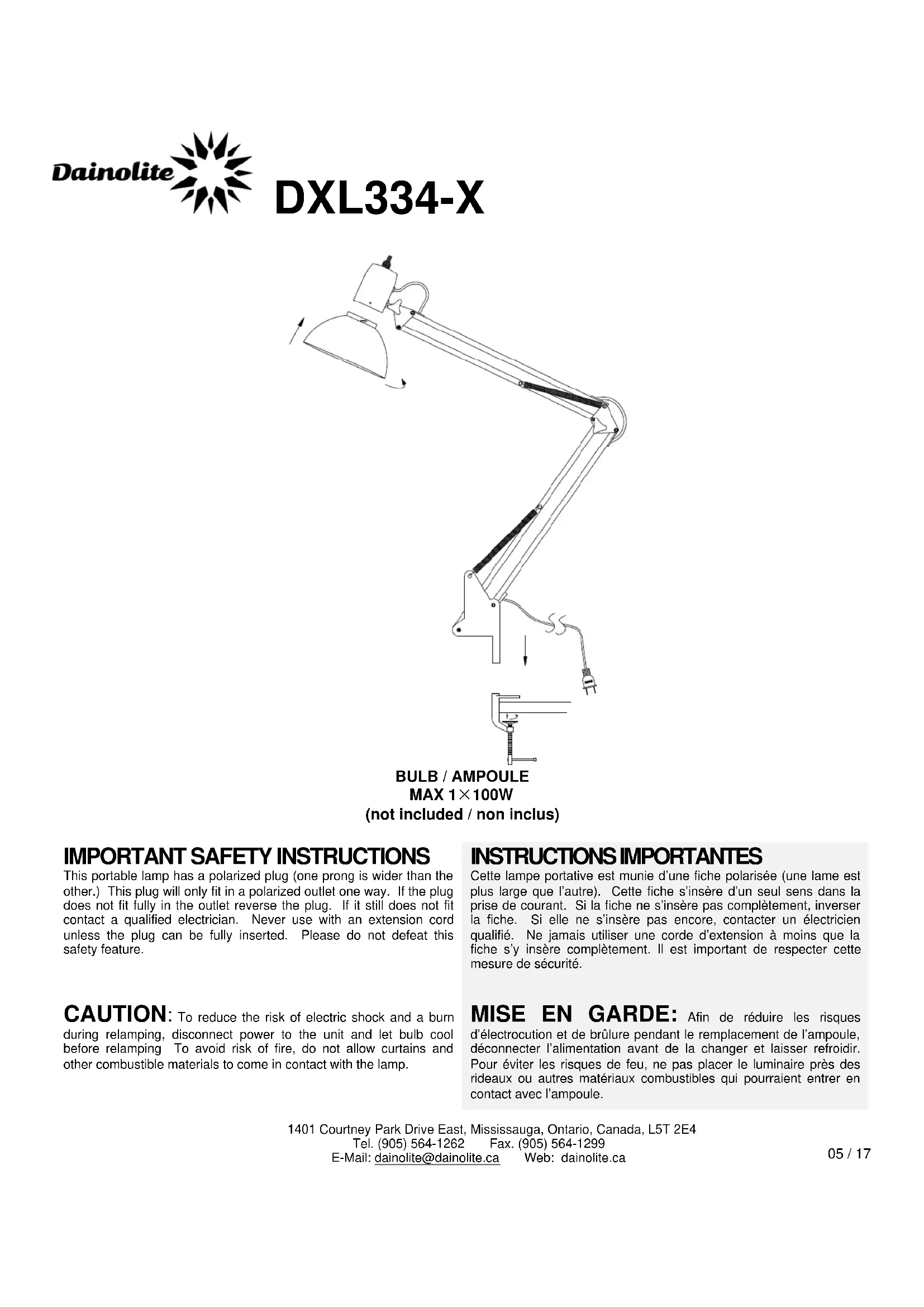 This portable lamp has a polarized plug (one prong is wider than the other.) This plug will only fit in a polarized outlet one way. If the plug does not fit fully in the outlet reverse the plug. If it still does not fit contact a qualified electrician. Never use with an extension cord unless the plug can be fully inserted. Please do not defeat this safety feature. INSTRUCTIONS IMPORTANTES Cette lampe portative est munie d’une fiche polarisée (une lame est plus large que l’autre). Cette fiche s’insère d’un seul sens dans la prise de courant. Si la fiche ne s’insère pas complètement, inverser la fiche. Si elle ne s’insère pas encore, contacter un électricien qualifié. Ne jamais utiliser une corde d’extension à moins que la fiche s’y insère complètement. Il est important de respecter cette mesure de sécurité. CAUTION: To reduce the risk of electric shock and a burn during relamping, disconnect power to the unit and let bulb cool before relamping To avoid risk of fire, do not allow curtains and other combustible materials to come in contact with the lamp. MISE EN GARDE: Afin de réduire les risques d’électrocution et de brûlure pendant le remplacement de l’ampoule, déconnecter l’alimentation avant de la changer et laisser refroidir. Pour éviter les risques de feu, ne pas placer le luminaire près des rideaux ou autres matériaux combustibles qui pourraient entrer en contact avec l’ampoule. 05 / 17 1401 Courtney Park Drive East, Mississauga, Ontario, Canada, L5T 2E4 Tel. (905) 564-1262 Fax. (905) 564-1299 E-Mail: dainolite@dainolite.ca Web: dainolite.ca