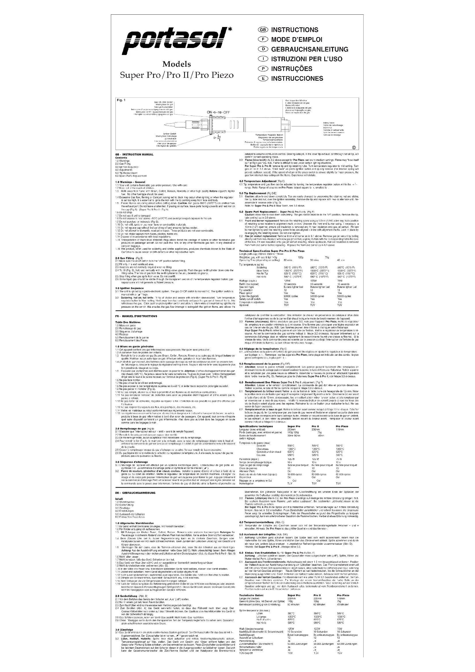 directly out from iron. Replace with new gas jet venturi, aligning its flats with the corresponding flat in the boreof the iron. Fit new insulation onto gas jet venturi ensuring, where applicable, that old insulation is removedfrom front end burner before replacing. Replace the front end burner as in 6.1 aboveTechnical Specification Super Pro Pro II Pro PiezoLength (with cap) 230mm 230mm 178mmWeight(no gas, with cap & tip) 143g 126g 75g Operating Time (depending on setting) 60 mins 60 mins 45 min Tip temperature (up to) Soldering 580°C (1075°F) 580°C (1075°F) 580°C (1075°F) Blow Torch 1300°C (2372°F) 1300°C (2372°F) 1300°C (2372°F) Hot Air Tip 625°C (1157°C) 625°C (1157°C) 625°C (1157°C) Hot Knife 580° C (1075°F) 580° C (1075°F) 580° C (1075°F) Wattage (equiv.) 125W 125W 75W Refill time (typical) 10 seconds 10 seconds 10 seconds Gas refill type Butane lighter fuel Butane lighter fuel Butane lighter fuel Tip selection 12 12 13Piezo ignitor Yes Yes Yes Ignitor life (typical) 50000 cycles 50000 cycles 50000 cycles Safety cut-off switch Yes Yes YesTemperature adjustable Yes Yes YesApproval TUV TUV TUVcatalyseur de contrôler la combustion. Une émission de chaleur en provenance du catalyseur situé dansl’orifice d’échappement ou de la panne d’air chaud indique le mode de fonctionnement de l’appareil.