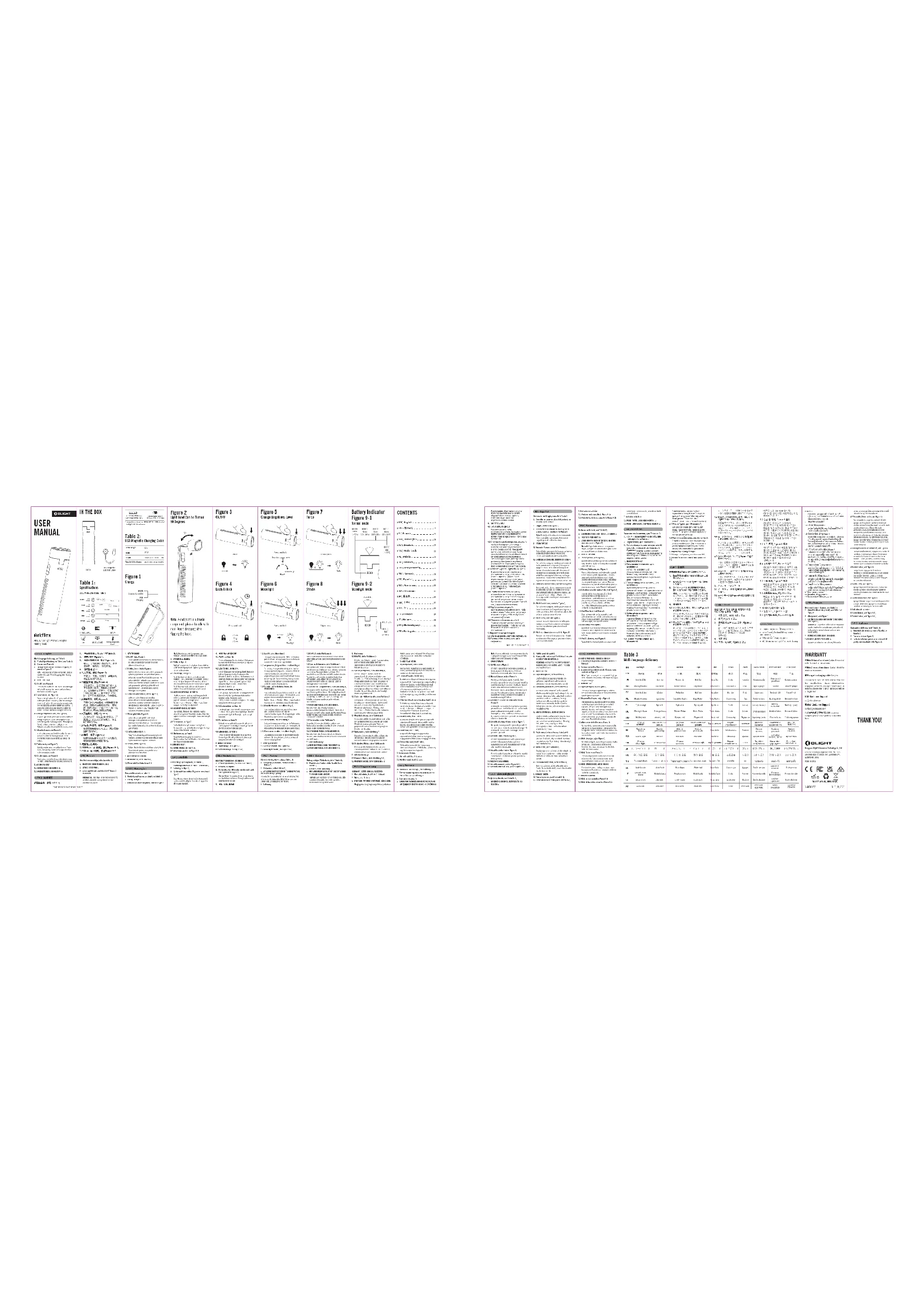 Dictionnaire multi-langues, voir Table 3 ;1. Caractéristiques du produit, voir Table 1 et Table 2 ; 2. Chargement, voir Figure 1 ; 3. La tête de la lampe peut pivoter à 90 degrés, voir Figure 2; Remarque : le pivot de la tête est un composant fragile, veuillez le manipuler avec précaution et évitez de faire tomber la lampe après en avoir tourné la tête. 4. Instructions d'utilisation ci-dessous :4.1 Allumer/Éteindre, voir Figure 3; Appuyez sur le bouton pour allumer/éteindre la ( FR ) Français lampe. La lampe accédera au niveau de luminosité mémorisé lorsqu'elle sera rallumée.4.2 Verrouiller/Déverrouiller, voir Figure 4; Pour verrouiller la lampe lorsqu'elle est éteinte, appuyez sur le bouton et maintenez-le enfoncé pendant environ 2 secondes jusqu'à ce que le mode Luciole s’allume puis s'éteigne. En mode verrouillage, si vous n’exécutez pas la bonne manipulation pour déverrouiller la lampe, cette lumière ne s'allumera pas et l'indicateur clignotera brièvement en rouge. Pour déverrouiller la lampe, appuyez sur l'interrupteur et maintenez-le enfoncé pendant environ 1 seconde jusqu'à ce que le mode Luciole soit activé.4.3 Changer le niveau de luminosité, voir Figure 5; En mode lumière blanche, appuyez sur le bouton et maintenez-le enfoncé pour changer le niveau de luminosité. La luminosité variera selon l’ordre suivant : Luciole (ou Turbo)->Faible->Moy-en->Élevé->Faible. Relâchez le bouton au bon moment pour sélectionner la luminosité souhaitée.4.4 Mode Luciole, voir Figure 6; Lampe éteinte, appuyez sur le bouton et maintenez-le enfoncé pendant plus d’une seconde pour accéder au mode Luciole. Si le mode mémorisé est le mode Luciole, il suffit d'appuyer sur le bouton brièvement.4.5 Mode Turbo, voir Figure 7; Appuyez rapidement deux fois sur le bouton pour accéder au mode Turbo et appuyez rapidement deux fois de nouveau pour revenir au dernier mode mémorisé.4.6 Mode Stroboscope, voir Figure 8; Appuyez trois fois ou plus sur le bouton pour activer le mode Stroboscope. Appuyez sur le bouton ou maintenez-le enfoncé pour sortir ce mode.5. Indicateur de batterie :5.1 Mode Normal, voir Figure 9-1 ;5.2 Mode Luciole, voir Figure 9-2 ;Dizionario multilingua, vedi Tabella 3;1. Specifiche del prodotto, vedere Tabella 1 e Tabella 2;2. Caricare, vedere Figura 1;3. La testa della luce può essere ruotata di 90 gradi, come mostrato nella Figura 2;( IT ) ItalianoNota: il perno della testa è un componente fragile, si prega di maneggiarlo con cura. Evitare di farlo cadere dopo aver capovolto la testa.4. COME OPERARE4.1 On/Off, vedere Figura 3;Premere il pulsante per accendere/spegnere. La torcia accederà direttamente al livello di luminosità memorizzato alla ri accensione.4.2 Blocco/Sblocco, vedere Figura 4;Per bloccare la torcia quando è spenta, tieni premuto il pulsante (per circa 2 secondi) finché la modalità Moonlight non viene disattivata. Quando la luce viene azionata in modalità di blocco, l'indicatore rosso si accenderà brevemente come segnale. Per sbloccare la torcia, tieni premuto il pulsante per circa 1 secondo fino a quando la modalità Moonlight è attiva.4.3 Modificare il livello di luminosità, vedere Figura 5;In modalità luce bianca, tieni premuto il pulsante per modificare i livelli di luminosità. La luminosità passerà attraverso le seguenti modalità: Moonlight (o Turbo)->Basso->Medio->Al-to->Basso. Rilasciare il pulsante per selezionare il livello di luminosità.4.4 Modalità al chiaro di luna, vedere Figura 6;Da spenta, tenere premuto il pulsante per oltre 1 secondo per accedere alla modalità Moonlight. Se la modalità memorizzata è Moonlight, basta premere il pulsante.4.5 Modalità Turbo, vedere Figura 7;Premere rapidamente due volte il pulsante per accedere alla modalità Turbo e premere nuovamente due volte rapidamente per tornare alla modalità memorizzata.4.6 Modalità strobo, vedere Figura 8;Premi tre volte il pulsante per attivare la modalità stroboscopica. Per tornare, premi il pulsante o tienilo premuto.5. Indicatore della batteria:5.1 Modalità normale, vedere Figura 9-1;5.2 Modalità chiaro di luna, vedere Figura 9-2;Viacjazyčný slovník, pozri tabuľku 3;1. Špecifikácia produktu, pozri tabuľku 1 a tabuľku 2;( SK ) Slovenskýjazyk2. Nabite, pozri obrázok 1;