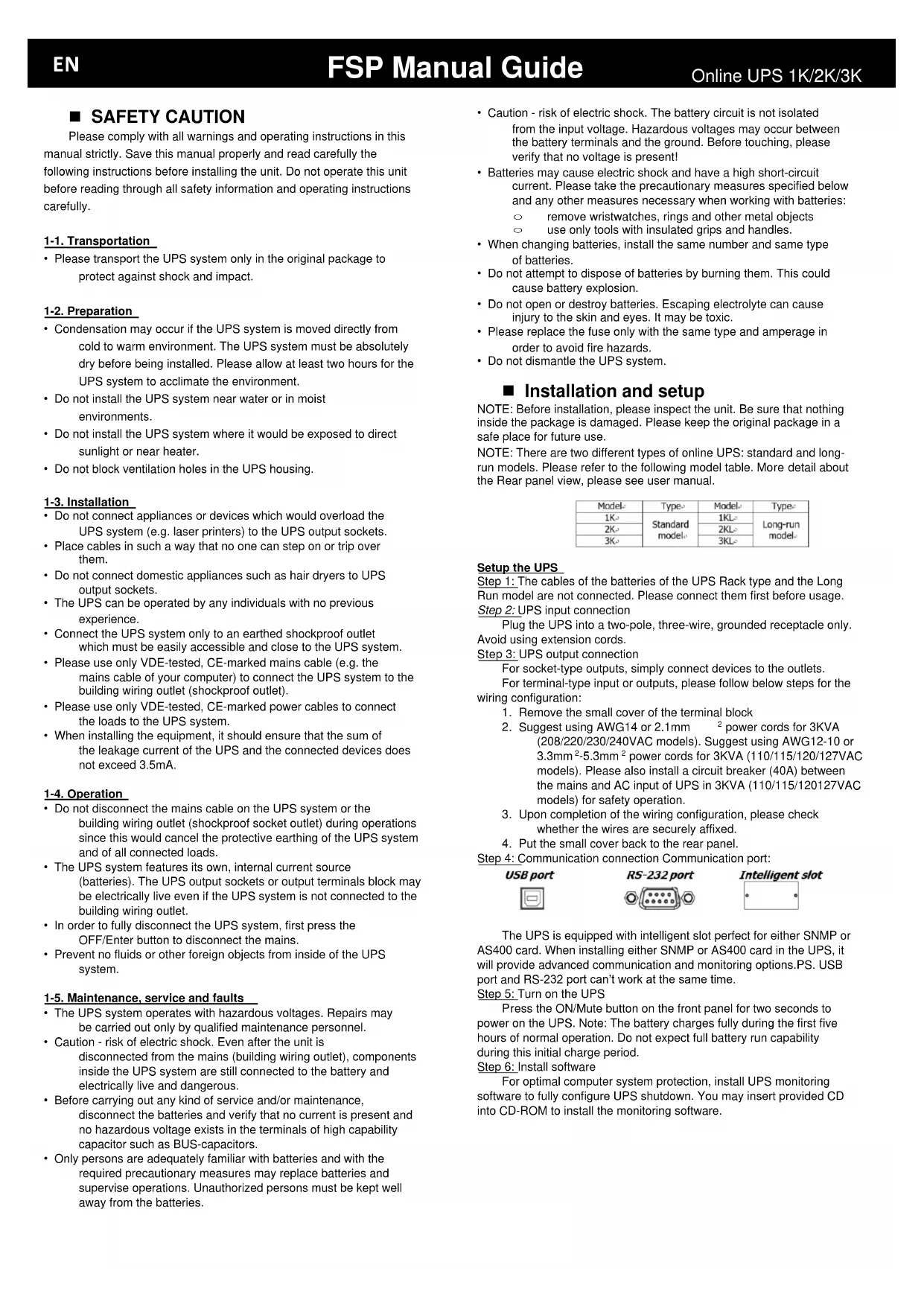 Configuration de l'onduleur É tape 1 : Les câbles des batteries de l'onduleur type rack et du modèle à longue autonomie ne sont pas raccordés. Veuillez d'abord les raccorder avant utilisation. É tape 2 : Raccordement à l'entrée de l'onduleur Branchez l'onduleur uniquement sur une prise à deux pôles, trois fils et raccordée à la terre. É vitez d'utiliser des rallonges. É tape 3 : Raccordement à la sortie de l'onduleur Pour les sorties de type prise, branchez simplement les appareils sur les prises. Pour les entrées ou les sorties de type borne, veuillez suivre les étapes ci-dessous pour la configuration du câblage : 5. Enlevez le petit couvercle du bornier 6. Il est conseillé d'utiliser des cordons électriques AWG14 ou 2,1 mm pour 3 KVA (Modèles 208/220/230/240 V CA). Il est conseillé d'utiliser des cordons électriques AWG12-10 ou 3,3 mm -5,3 mm pour 3 KVA (Modèles 110/115/120/127 V CA). Veuillez également installer un disjoncteur (40 A) entre les entrées secteur et CA de l'onduleur en 3 KVA (Modèles 110/115/120/127 V CA) pour un fonctionnement en toute sécurité. 7. Après avoir terminé la configuration du câblage, veuillez vérifier si les fils sont solidement fixés. 8. Remettez le petit couvercle sur le panneau arrière. É tape 4 : Connexion de communication Port de communication : Port USB Port RS-232 Emplacement intelligent L'onduleur est équipé d'un emplacement intelligent, idéal pour une carte SNMP ou AS400. L'installation d'une carte SNMP ou AS400 dans l'onduleur procure des options avancées de communication et de surveillance. Le port USB et le port RS-232 ne peuvent pas fonctionner en même temps. É tape 5 : Allumer l'onduleur Appuyez pendant deux secondes sur le bouton MARCHE/Muet du panneau avant pour mettre l'onduleur sous tension. Remarque : La batterie se charge complètement pendant les cinq premières heures de fonctionnement normal. Ne vous attendez pas à disposer de la pleine capacité de fonctionnement des batteries pendant cette période de charge initiale. É tape 6 : Installation du logiciel Pour une protection optimale du système informatique, installez le logiciel de surveillance de l'onduleur afin de configurer complètement l'arrêt de l'onduleur. Vous pouvez insérer le CD fourni dans le lecteur de CD-ROM pour installer le logiciel de surveillance. FROnline UPS 1K/2K/3K FSP Manual Guide Fonctionnement de l'écran LCD et des boutons Fonctionnement/réglage détaillé et icônes d'indication de l'écran LCD. Veuillez consulter le manuel d'utilisation. Indicateur d'avertissement Avertissement Icône (clignotante) Alarme Surcharge