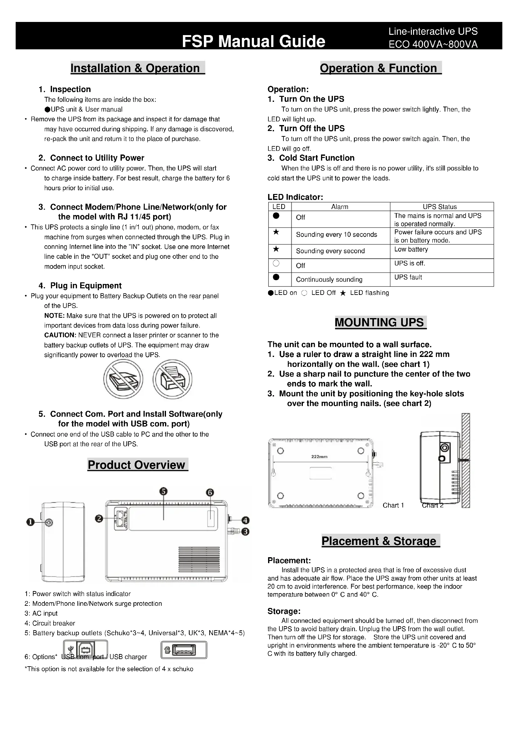 de serrure sur les clous de montage. (Chart 2) Chart 1 Chart 2 Placement et stockage Placement: Installez l'onduleur dans une zone protégée, exempte de poussière et où l'air circule correctement. Éloignez l’onduleur d’au moins 20 cm des autres unités pour éviter les interférences. Pour de meilleures performances, maintenez la température intérieure entre 0 ° C et 40 ° C. Espace de rangement en cas de non-utilisation : Tous les équipements connectés doivent être éteints, puis déconnectés de l'onduleur pour éviter de décharger la batterie. Débranchez l’onduleur de la prise murale. Ensuite, éteignez l'onduleur pour le stockage. Rangez l’onduleur couvert et droit dans des environnements où la température ambiante est comprise entre -20 ° C et 50 ° C avec la batterie complètement chargée. Onduleur de secours
