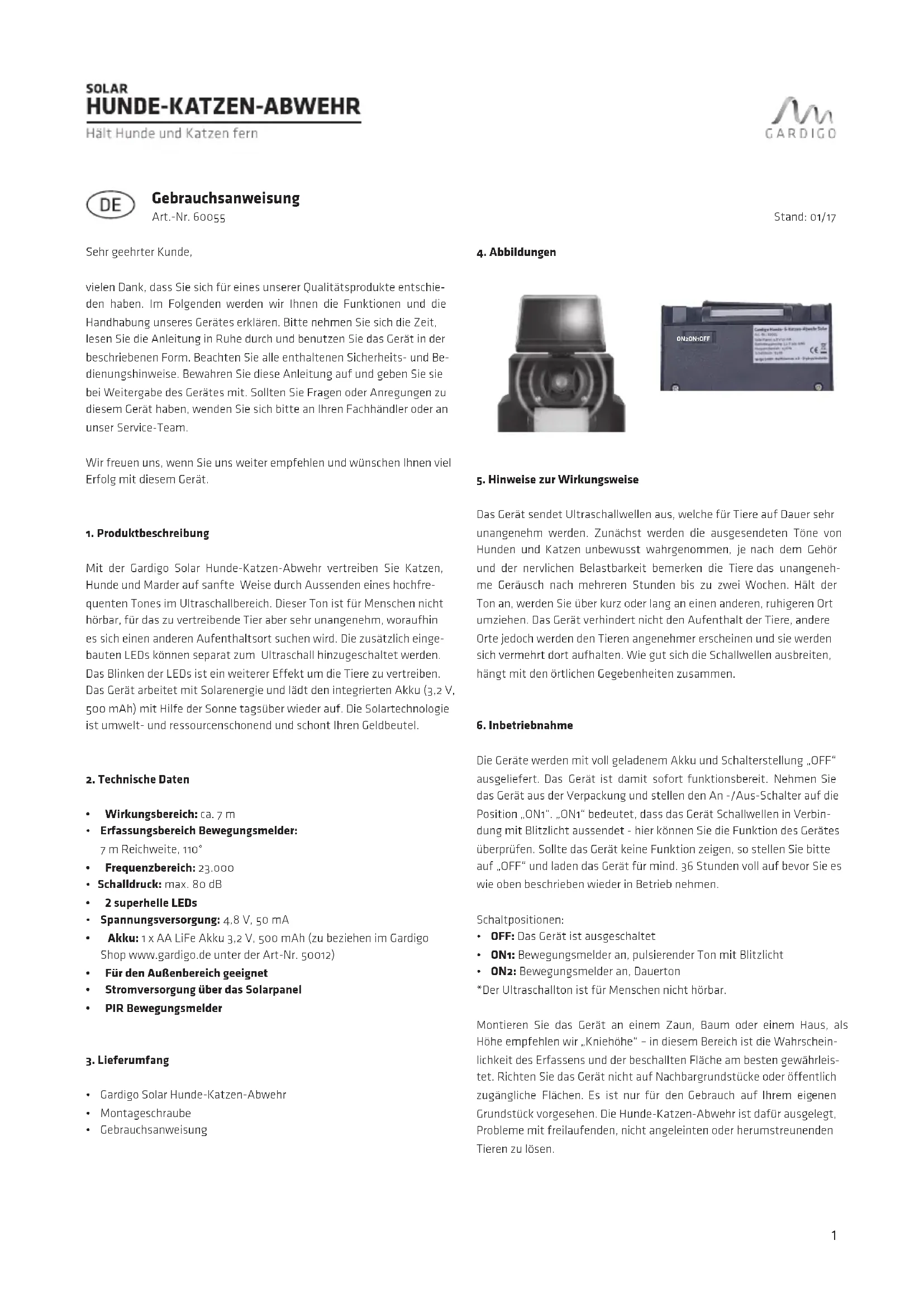 La garantie comprend l‘élimination de tous les défauts causés par un vice matériel ou de fabrication. Étant donné que Gardigo n‘a pas d‘influence sur le montage ou la commande correcte et conforme, la garantie s‘applique uniquement à l‘intégralité et à la qualité irréprocha- ble de l‘appareil. L‘entreprise décline toute responsabilité pour les dom- mages et dommages consécutifs liés à ce produit. Cela vaut notamment lorsque des modifications ou tentatives de réparation sur l‘appareil, la modification des commutations ou l‘utilisation d‘autres composants ou les erreurs de commande, le traitement négligent ou l‘utilisation abusive entraînent des dommages. Service: service@gardigo.de VotreÉquipeGardigo Consigne sur la protection de l´environnement Ce produit ne doit pas être jeté dans vos ordures ménagères lorsqu´il parvient en fin vie, mais doit être déposé dans un centre de collecte pour le recyclage d´appareils électriques et électro- niques. Le symbole indiqué sur le produit, dans le mode d´emploi ou sur l´emballage le signale. Les matériaux sont réutilisables selon leurs caractéristiques. Grâce au recyclage, à la réutilisation matérielle ou toute autre forme de recyclage, vous contribuez considérablement à la protection de notre environnement. Veuil- lez vous informer auprès de votre municipalité pour connaître le centre de collecte compétent. Ne jetez pas vos batteries et chargeurs d‘accus avec les déchetsdomestiques! La loi oblige chaque consommateur à se débarrasser de toutes les batteries ou tous les chargeurs d‘accus dans un centre de ras- semblement prévu à cet effet dans sa commune/son quartier ou dans le commerce afin qu‘un traitement écologique des déchets soit garanti. Éliminez les batteries et les chargeurs d‘accus uni- quement lorsqu‘ils sont déchargés.7 Manualdeinstrucciones Art.-No. 60055 Estimado cliente, le agradecemos que haya elegido uno de nuestros productos de calidad. A continuación explicamos en detalle las funciones y el manejo de nuest- ro aparato. Tómese algo de tiempo para leer las instrucciones con atenci- ón. Tómese algo de tiempo para leer las instrucciones con atención hasta el final. Siga todas las indicaciones de seguridad y de manejo. Guarde este manual para poder entregarlo junto al aparato si se lo cede a otra persona. Si tiene alguna pregunta o algún comentario acerca de este aparato, póngase en contacto con su distribuidor o con nuestro equipo de atención al cliente. Esperamos que pueda recomendarnos y le deseamos que disfrute el uso de este aparato. 1.Generalidades Perros y gatos son las mascotas más populares, y me encantó la bien- venida en el jardín o en la sala de estar y. Sin embargo, hay lugares que deben permanecer los animales libres como folletos o canteras de arena, estanques o la entrada de la casa. El perro y el gato defensa de Gardigo Solar vende animales usando ultrasonido de estos lugares. De un mo- vimiento se registra cuando un animal está cerca y empieza el sonido ultrasónico. Las notas altas son inicialmente inconscientemente perci- ben, son permanentes pero muy incómodo y animales que buscan una estancia más tranquila más agradable. 2.Datostécnicos