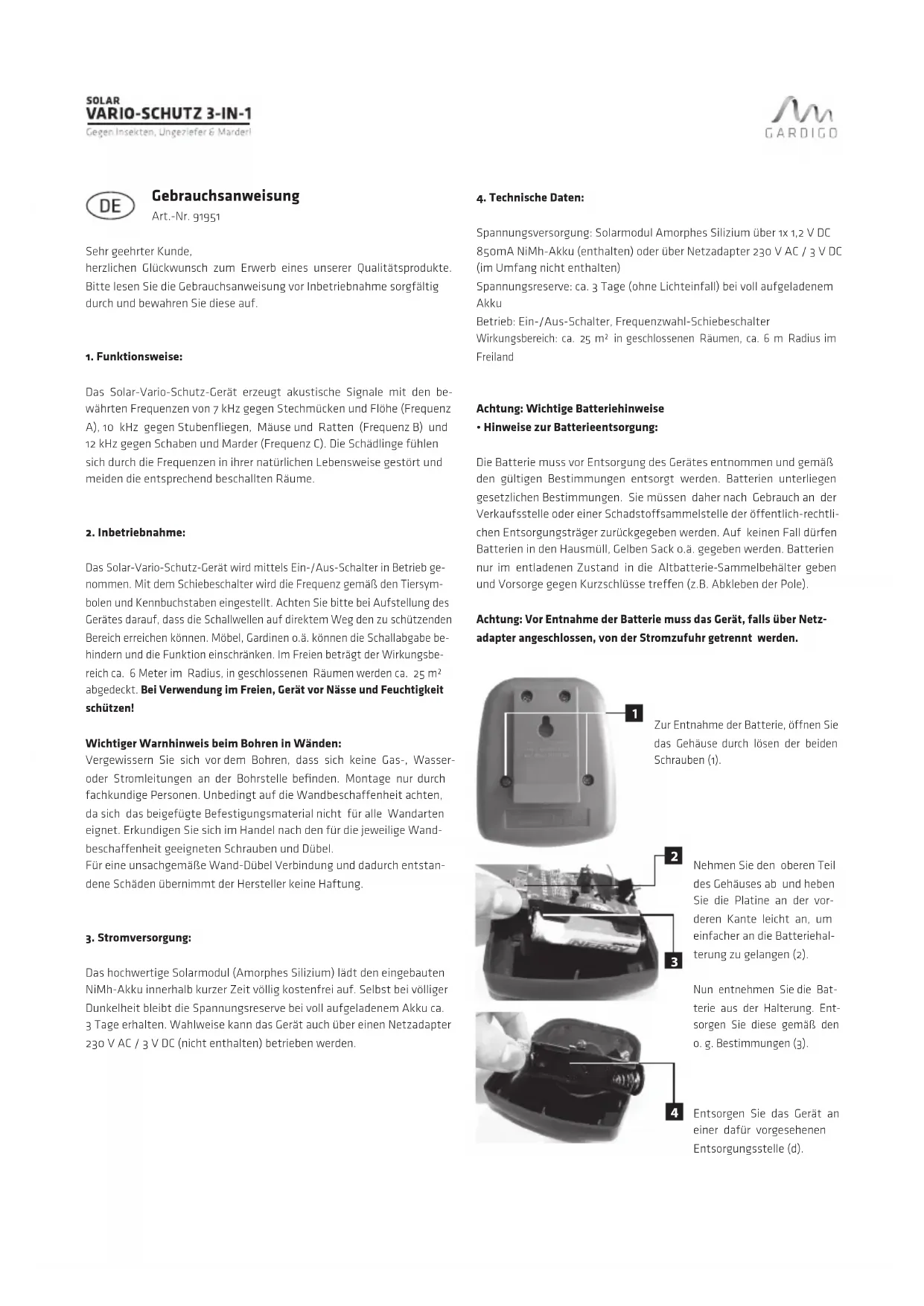 Nous accordons une garantie de 2 ans sur cet appareil. La garantie por- te sur l’élimination de tous les vices dus à un matériel non correct ou à un défaut de fabrication. Aucune garantie n‘est donnée sur des pièces d‘usure (p. ex. piles). Etant donné qu‘Gardigo n’a aucune influence sur le montage ou la commande correcte et adéquate, elle n’assure que la garantie de l’intégralité et du matériel correct. Le fabricant décline tou- te responsabilité pour les dommages ou dommages subséquents liés à ce produit. Ceci est notamment valable lorsque des modifications ou des tentatives de réparation sont effectuées sur l’appareil, lorsque des circuits sont modifiés ou que d’autres composants ont été utilisés ou encore lorsque les dommages résultent d’erreurs de commande, d’un traitement négligent ou abusif.Atención: Información impoortante relavitva a las pilas