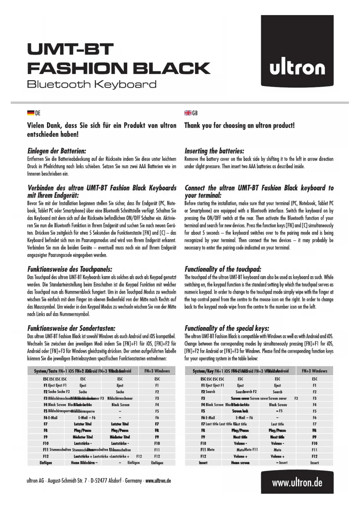 UMT-BT - Clavier Ultron - Notice d'utilisation et mode d'emploi gratuit