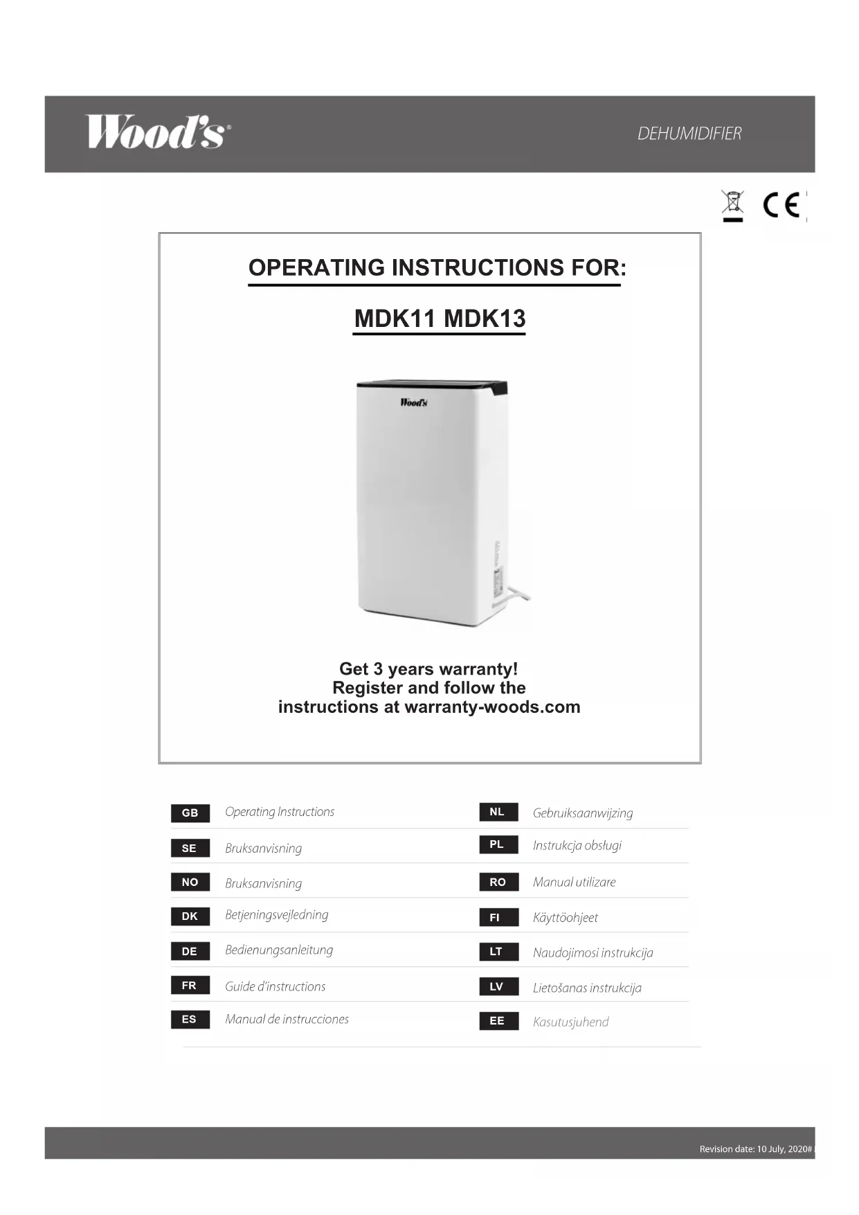 Si le déshumidificateur doit faire l’objet d’un contrôle, vous devez tout d’abord contacter votre revendeur. Une preuve d’achat vous sera demandée pour toute réclamation sous garantie. GARANTIES Garantie de 2 ans pour tout défaut de fabrication. Notez que la garantie n'est valable que sur présentation du reçu. REMARQUE! Obtenez 3 ans de garantie ! Enregistrez-vous sur warranty-woods.com Veuillez consulter woods.se pour de plus amples informations. Limites conseillées lors de l’utilisation Temp. MDK11/MDK13 +5 ˚C à +35 ˚C Humidité relative : 30 % à 90 % Niveau d’humidité recommandé : env. 50 % HR IMPORTANT! - Les déshumidificateurs Wood’s doivent être branchés sur une prise de terre. La norme électrique doit être de 220 V-240 V 50 HzF