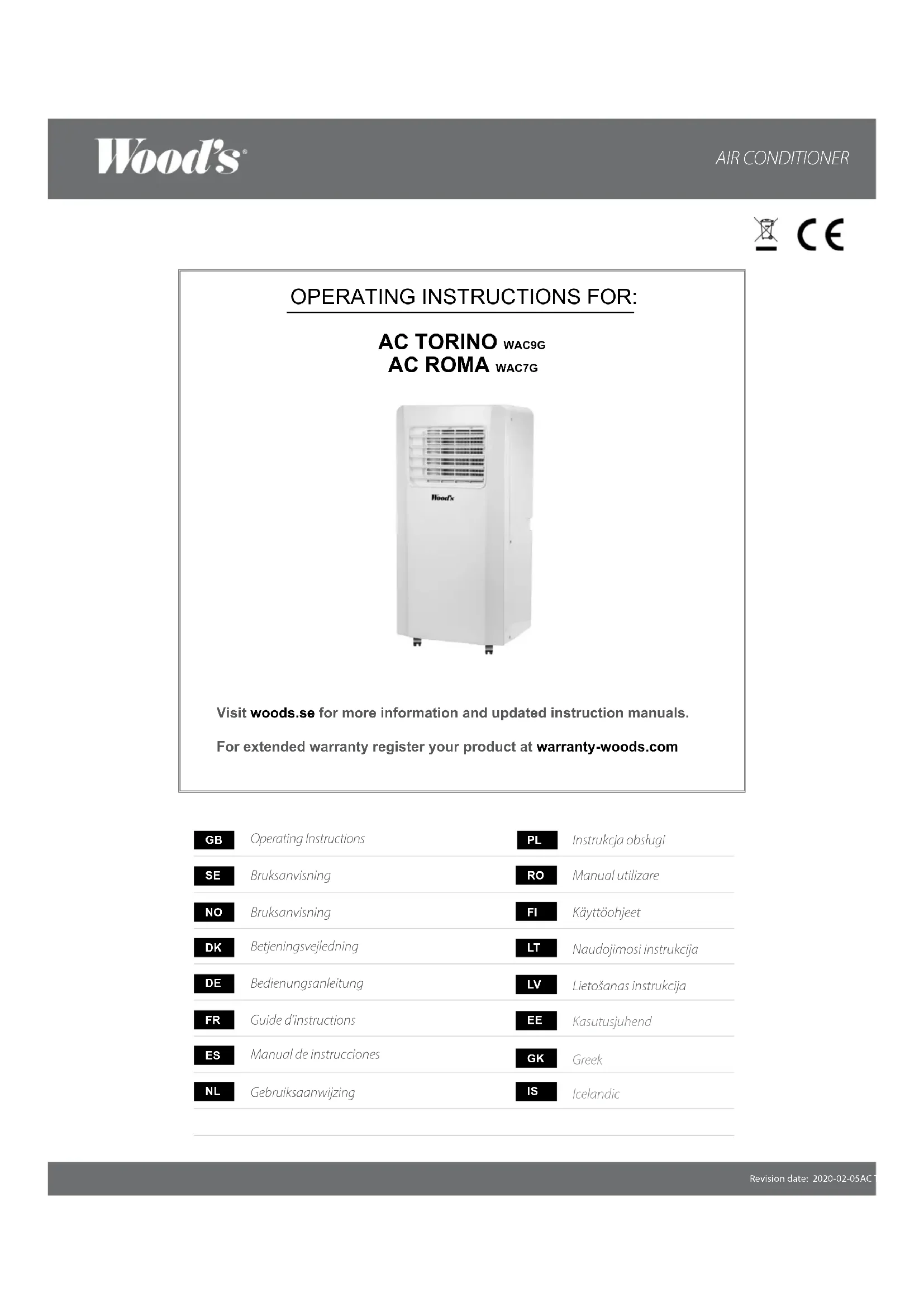 Guide d’instructions *Ce marquage indique que ce produit ne doit pas être éliminé avec d'autres déchets ménagers dans l'UE. An d'éviter qu’une mise au rebut incontrôlée des déchets ne nuise à l'environnement ou à la santé humaine, recyclez l’appareil de manière responsable an de promouvoir la réutilisation durable des ressources matérielles. Pour retourner votre appareil, veuillez utiliser les systèmes de retour et de collecte ou contacter le détaillant chez lequel le produit a été acheté. Il peut reprendre ce produit pour un recyclage environnemental sûr. REMARQUE! Inscrivez-vous à www.warranty-woods. com et découvrez comment prolonger la garantie. Veuillez consulter www. woods.se pour de plus amples informations. Limites conseillées lors de l’utilisation La meilleure température ambiante de fonctionnement pour le refroidissement est entre 17 et 35 °C. L’unité fonctionne jusqu’à +45 °C. Paramètre de fusible : φ5,0 x 20mm 3,15 A, 250 VCA. AC Roma AC Torino Capacité de refroidissement 2,05W 2,6WConsommation d’alimentation 0,785KW 1.0KWDébit d’air : 320m³ / h 320m³ / hClasse d’énergie A ADéshumidification 19,2 L / 24h 24 L / 24h Réglage de température 16-31°C 16-31°C Température de fonctionnement 18-35°C 18-35°C EER 2,6 2,6Gaz réfrigérant R290/140g R290/160g Niveaux sonores en décibels 65dB 65dB Poids 18kg/19,5kg 19kg/20,5kgDimensions en mm, L x B x H 330x280x680 330x280x680 CARACTÉRISTIQUES TECHNIQUES *Des modications et des améliorations techniques peuvent être apportées. Toutes les valeurs sont approximatives et peuvent varier en raison des circonstances externes telles que la température, la ventilation et l'humidité. REMARQUE! Inscrivez-vous à www.warranty-woods. com et découvrez comment prolonger la garantie. Veuillez consulter www.woods. se pour de plus amples informations. Garanties Garantie consommateur de 2 ans contre les défauts de production. Veuillez noter que la garantie est uniquement valable en produisant un reçu. La garantie est uniquement valable si le produit est utilisé conformément aux instructions et aux avertissements de sécurité indiqués dans ce manuel. La garantie ne couvre pas les dommages causés par la manipulation inadaptée du produit. REMARQUE : La garantie de 2 ans est uniquement applicable aux consommateurs et pas à l’utilisation commerciale de l’unité.ES