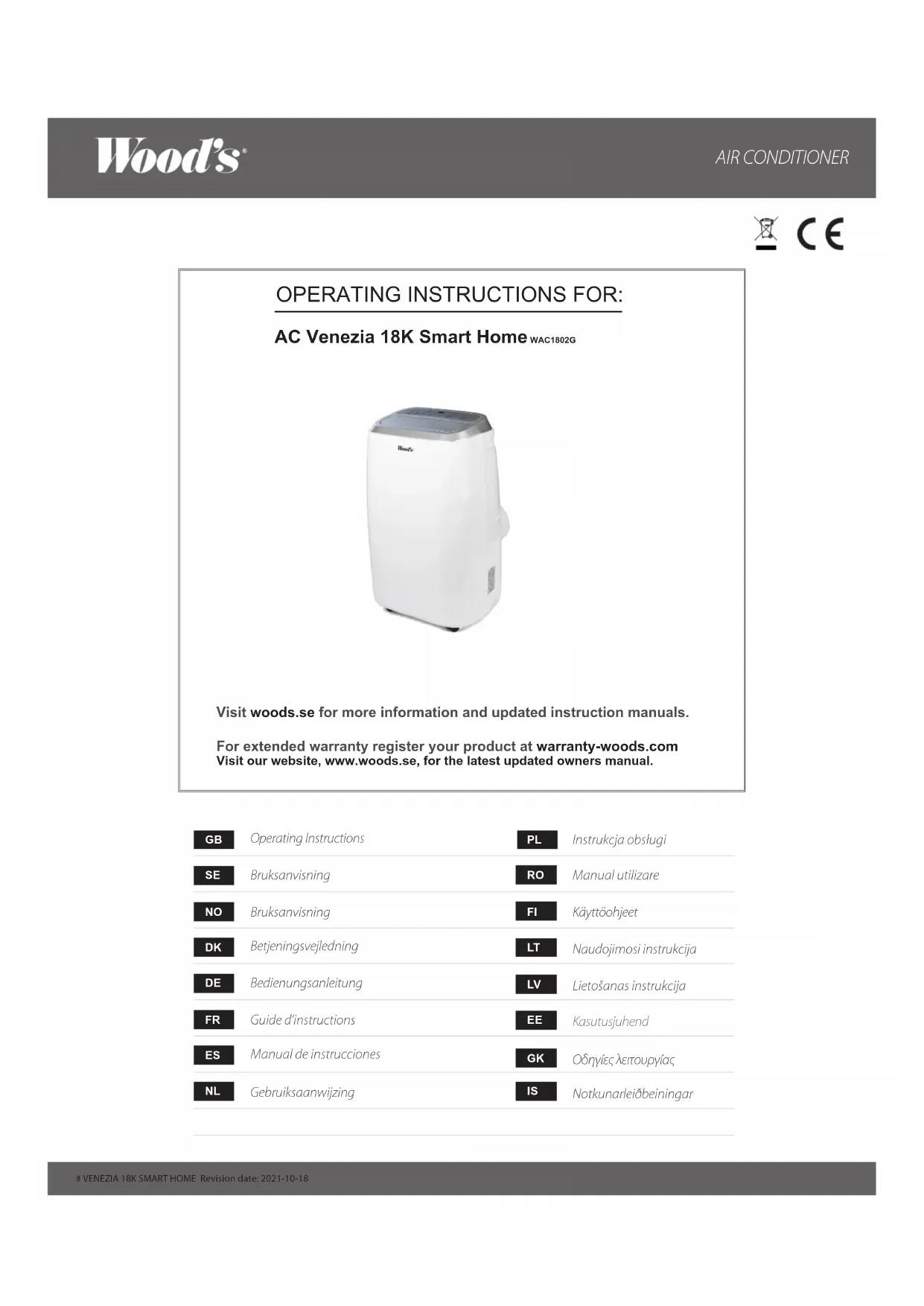 Guide d’instructions *Ce marquage indique que ce produit ne doit pas être éliminé avec d’autres déchets ménagers dans l’UE. An d'éviter qu’une mise au rebut incontrôlée des déchets ne nuise à l'environnement ou à la santé humaine, recyclez l’appareil de manière responsable an de promouvoir la réutilisation durable des ressources matérielles. Pour retourner votre appareil, veuillez utiliser les systèmes de retour et de collecte ou contacter le détaillant chez lequel le produit a été acheté. Il peut reprendre ce produit pour un recyclage environnemental sûr. *Les piles usagées ne doivent pas être jetées avec les ordures ménagères, car elles peuvent contenir des éléments toxiques et des métaux lourds nocifs pour l'environnement et dangereux pour la santé. Rapportez les piles usagées à un centre de recyclage approprié. REMARQUE ! Inscrivez-vous sur le site www. warranty-woods.com et découvrez comment prolonger la garantie. Rendez-vous sur www.woods.se pour plus d’informations. Limites conseillées lors de l’utilisation La meilleure température ambiante de fonctionnement pour le refroidissement est comprise entre 18 et 35 °C. L’unité fonctionne jusqu’à +43°C. Paramètre de fusible: φ5,0 x 20mm 2A, 250VCA. AC Venezia 18K Smart Home Capacité de refroidissement 5,2KWConsommation d’alimentation 2,0WDébit d’air: 680m³/hClasse d’énergie ADéshumidification 52,8L/24hRéglage de température 16-31 °CTempérature de fonctionnement 18-43°CEER 2,6Gaz réfrigérant R290/300 gNiveau sonore en décibels 56dB/65dBPoids 32kgDimensions en mm, L x B x H 376x490x768 CARACTÉRISTIQUES TECHNIQUES *Des modications et des améliorations techniques peuvent être apportées. Toutes les valeurs sont approximatives et peuvent varier en raison des circonstances externes telles que la température, la ventilation et l’humidité. REMARQUE ! Inscrivez-vous sur le site www.warranty-woods.com et découvrez comment prolonger la garantie. Rendez-vous sur www.woods.se pour plus d’informations. Garanties Garantie consommateur de 2 ans contre les défauts de production. Veuillez noter que la garantie est uniquement valable en produisant un reçu. La garantie est uniquement valable si le produit est utilisé conformément aux instructions et aux avertissements de sécurité indiqués dans ce manuel. La garantie ne couvre pas les dommages causés par la manipulation inadaptée du produit. REMARQUE : La garantie de 2 ans est uniquement applicable aux consommateurs et pas à l’utilisation commerciale de l’unité. RED:2014/53/EUEN 301 489-1V2.2.3,Projet EN 301 489-17 V3.2.2 EN 300 328 V2.2.2, EN62311:2008 EN 55014-1:2017, EN55014-2:2015EN IEC 61000-3-2:2019, EN61000-3-3:2013+A1:2019AC Venezia 18K Smart Home est conforme aux exigences techniques des normes suivantes :LVD:2014/35/EUEN 60335-2-40: 2003 + A11: 2004+A12: 2005 + A1: 2006+ A2: 2009+A13: 2012EN 60335-1: 2012 + A11: 2014 + A13: 2017 + A1: 2019 + A14: 2019+A2: 2019EN 62233: 2008EMC:2014/30/EU EN 55014-1:2017 EN 55014-2:2015ENIEC 61000-3-2:2019 EN 61000-3-3:2013+A1:2019FR