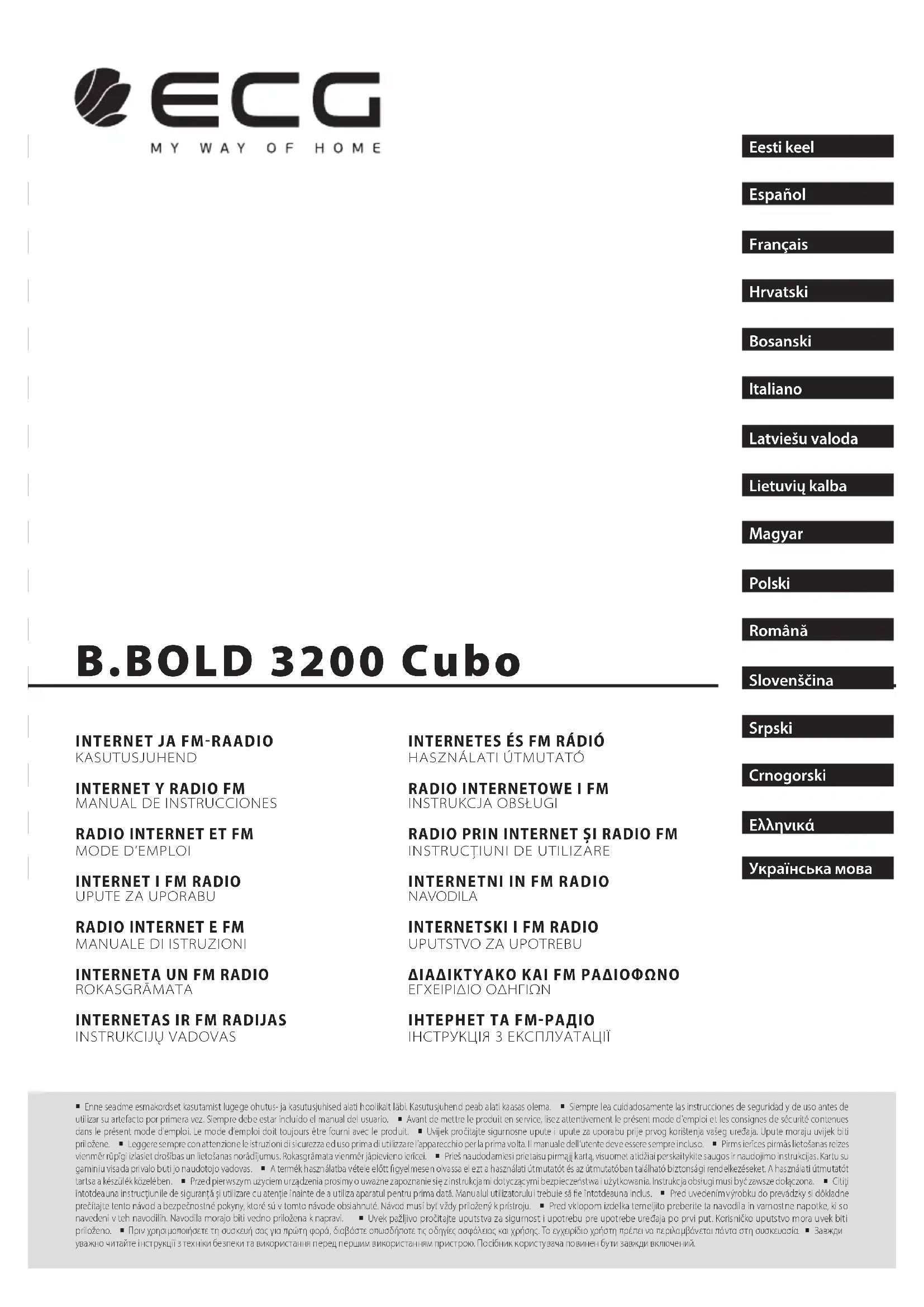 Papier d’emballage et carton ondulé – remettre dans les conteneurs de collecte de papiers. Film d’emballage, sacs PE, pièces en plastique – dans les conteneurs de collecte de plastique. ÉLIMINATION DU PRODUIT À LA FIN DE SA DURÉE DE VIE Liquidation des équipements électriques et électroniques usagés (en vigueur dans les pays membres de l’Union européenne et les autres pays européens disposant d’un système de tri des déchets) Le symbole gurant sur le produit ou l’emballage signie que le produit ne doit pas être traité comme une ordure ménagère courante. Remettez le produit à un lieu de collecte prévu pour le recyclage des équipements électriques et électroniques. Une élimination correcte du produit évite des impacts négatifs sur la santé humaine et l’environnement. Le recyclage des matériaux contribue à la protection de l’environnement. Pour plus d’informations sur le recyclage de ce produit, adressez- vous à la mairie, aux centres de traitement des déchets ménagers ou au point de vente où vous avez acheté le produit. Cet appareil est conforme aux exigences des directives de l’UE sur la compatibilité électromagnétique, la sécurité électriques et la problématique des métaux lourds dans les équipements électriques et électroniques. K+B Progress déclare par la présente que l’équipement radio de type ECG B.BOLD 3200 Cubo est conforme à la directive 2014/53/EU. La version intégrale de la Déclaration de conformité EU est disponible à l’adresse internet: www.ecg-electro.eu. Le mode d’emploi est disponible sur le site web www.ecg-electro.eu. Nous nous réservons le droit de modier le texte et les paramètres techniques. 08/05Hrvatski • Bosanski Hrvatski • Bosanski