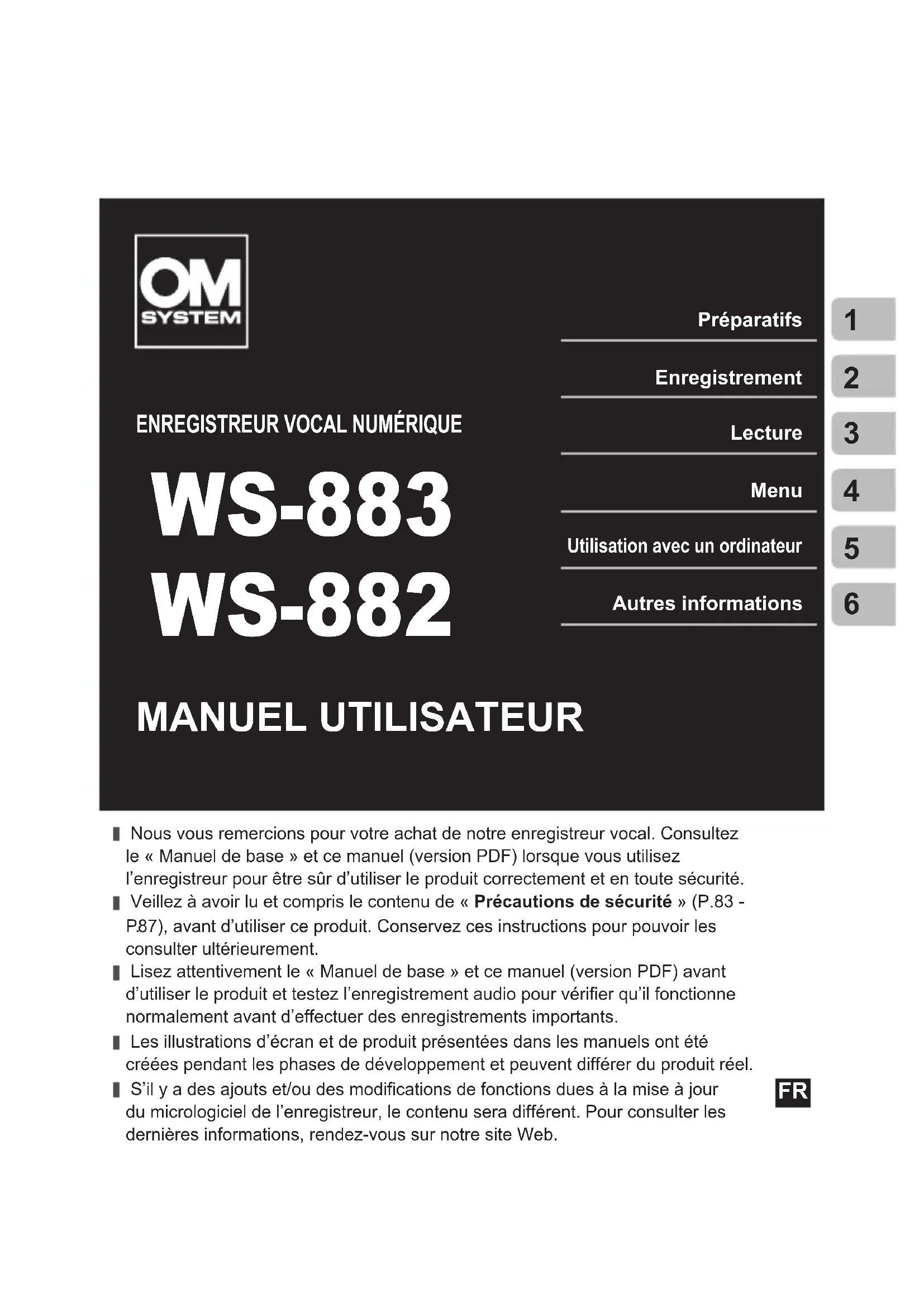 WS-883 WS-882 PréparatifsEnregistrementLecture Menu Utilisation avec un ordinateurAutres informations