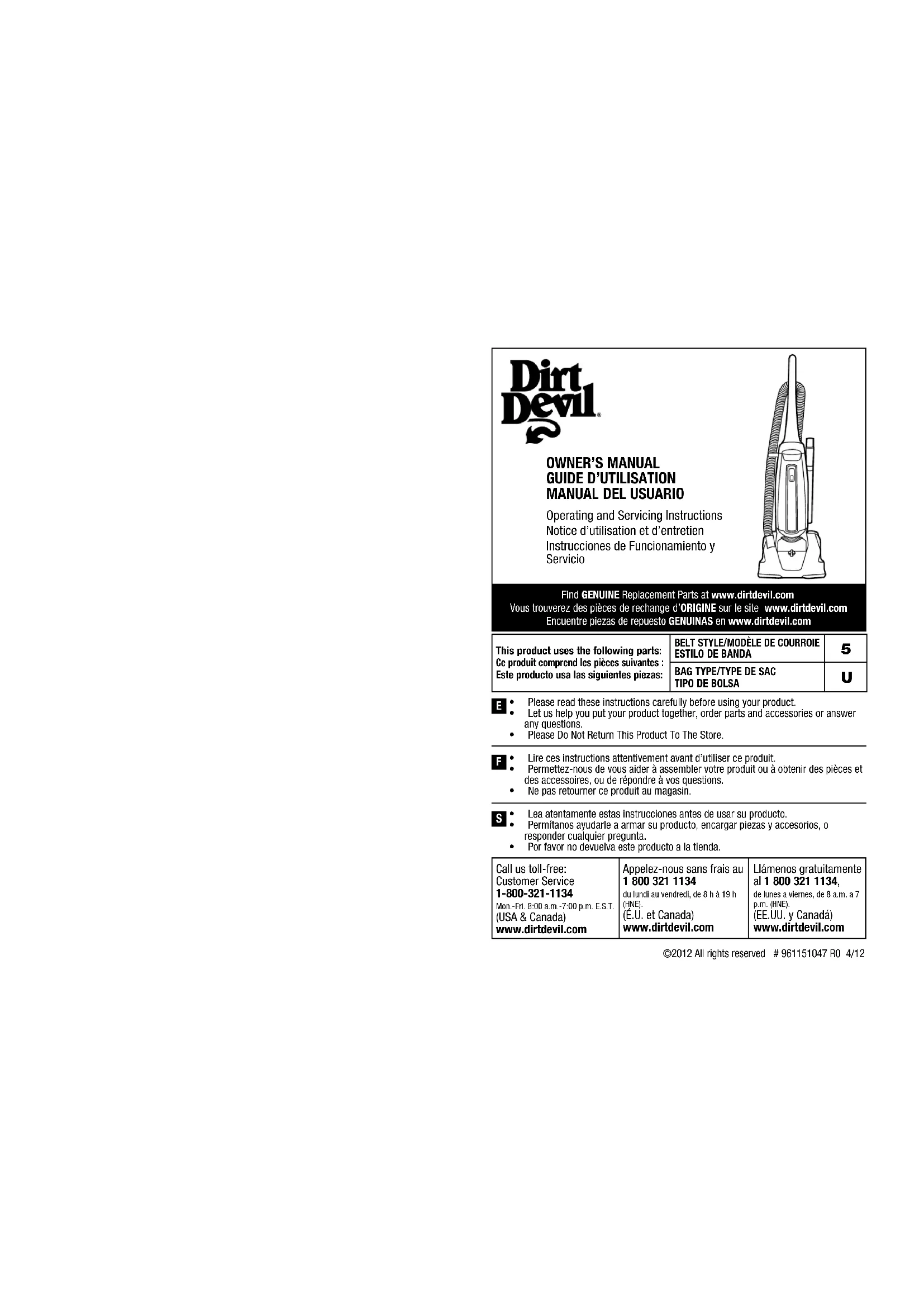 . Nous sommes persuadés que cet appareil vous satisfera pendant plusieurs années. Nous avons conçu ce produit pour vous faciliter la vie. Nous sommes très fiers de nos produits et nous espérons que vous serez aussi satisfait que nous de leur qualité et de leur performance. Merci d’utiliser les produits Dirt Devil