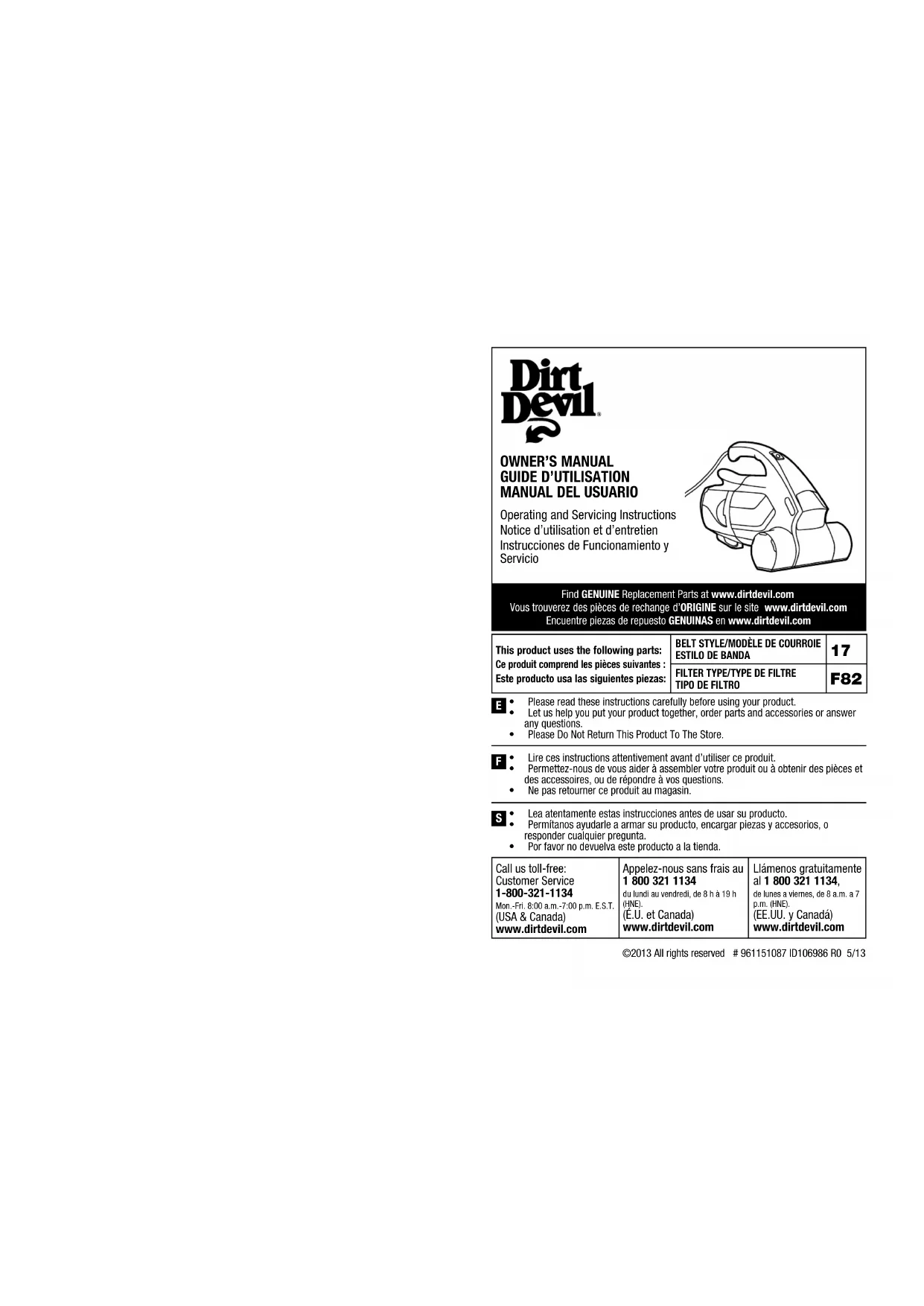 TOUTE AUTRE RÉPARATION DOIT ÊTRE EFFECTUÉE PAR UN REPRÉSENTANT AUTORISÉ SERVICE À LA CLIENTÈLE : 1-800-321-1134 Pourtouteaidesupplémentaire,consultezlesPagesJaunesafindeconnaîtrelesdistributeursRoyal autorisésouvisiteznotresiteWebwww.dirtdevil.com.Lesfraisdetransportversl’endroitoùsonteffectuéeslesréparationsetceuxdutransportderetourdoiventêtrepayésparlepropriétairedel’appareil.LespiècesdecetappareilpeuventfacilementêtreremplacéesetsontdisponiblesauprèsdesdistributeursoudétaillantsRoyal autorisés.Donneztoujourslenumérodumodèleetlecodedefabricationdevotreaspirateurlorsquevousdemandezdesinformationsouquevouscommandezdespiècesderechange.(Lenumérodemodèlefigureaubasdel’appareil.) Sil’aspirateurnefonctionnepasadéquatement,s’ilesttombé,aétéendommagé,aétélaisséàl’extérieurouesttombédans l’eau,l’expédieràuncentrederéparationavantdepoursuivrel’utilisation. IMPORTANT: READ CAREFULLY BEFORE ASSEMBLY AND USE. THIS PRODUCT IS INTENDED FOR HOUSEHOLD USE ONLY. IF USED COMMERCIALLY WARRANTY IS VOID.