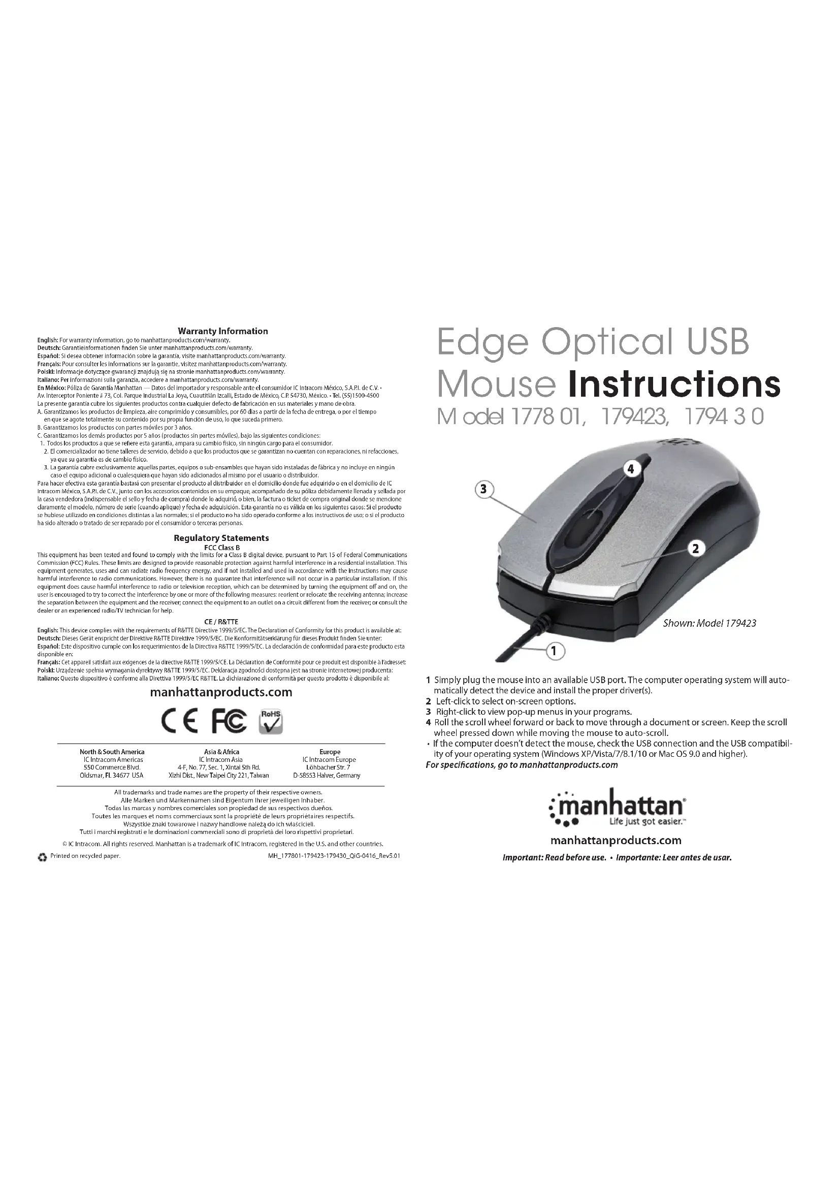- Si la computadora no detecta el ratón, compruebe la conexión USB y la com- patibilidad USB de su sistema operativo (Windows XP/Vista/7/8.1/10 ó Mac OS 9.0 y más alto). Para mas especicaciones, visite manhattanproducts.com. Français: Souris USB optique Edge 1 Connectez la souris à un port USB disponible. Votre système d’exploitation identie la souris et installe le(s) pilote(s) automatiquement). 2 Clic gauche pour activer des fonctions à l’écran. 3 Clic droit an d’acher des menus de contexte. 4 Tournez la molette de souris an de déler l’achage d’un document ou d’un site Web Appuyez-la constamment et bougez la souris pour la fonction déle- ment auto.