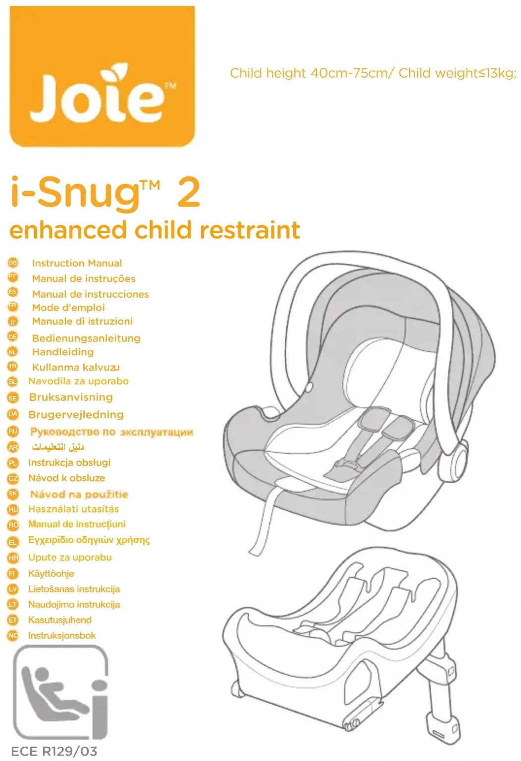 vous souhaite la bienvenue Nous vous félicitons d’avoir rejoint la famille Joie ! Nous sommes très heureux de pouvoir faire partie de votre voyage avec votre petit. En voyageant avec le dispositif de retenue pour enfants amélioré Joie i-Snug™ 2, vous utilisez un dispositif de retenue pour enfants amélioré de haute qualité i-Size, avec une sécurité entièrement certifiée. Veuillez lire ce manuel et suivre chaque étape pour assurer le confort et la meil-leure protection possible pour votre enfant.Pour utiliser ce dispositif de retenue pour enfants amélioré Joie avec la base i-Size conformément à la réglementation UN N°129, votre enfant doit respecter les conditions suivantes.Taille de l’enfant 40cm-75cm / Poids de l’enfant ≤ 13kg ; (Âge de l’enfant < 12 mois).Pour utiliser ce module de transport bébé avec la ceinture du véhicule, votre enfant doit respecter les conditions suivantes.Taille de l’enfant 40cm-75cm / Poids de l’enfant ≤ 13kg ; (Âge de l’enfant < 12 mois). Base Ces instructions présentent l'utilisation du module de transport bébé et de la base. Cette base peut aussi être utilisée avec d'autres modules de transport bébé Joie. Veuillez lire toutes les instructions de ce manuel avant d'installer et d'utiliser le produit.! IMPORTANT : À CONSERVER POUR TOUTE CONSULTATION ULTÉRIEURE.À LIRE ATTENTIVEMENT.Veuillez conserver le manuel d'instructions dans le compartiment de stockage en bas de la base, comme sur l'illustration à droite. Veuillez conserver le mode d'emploi dans la partie inférieure des pièces souples.Pour des informations sur la garantie, veuillez visiter notre site Web à l'adresse joiebaby.com